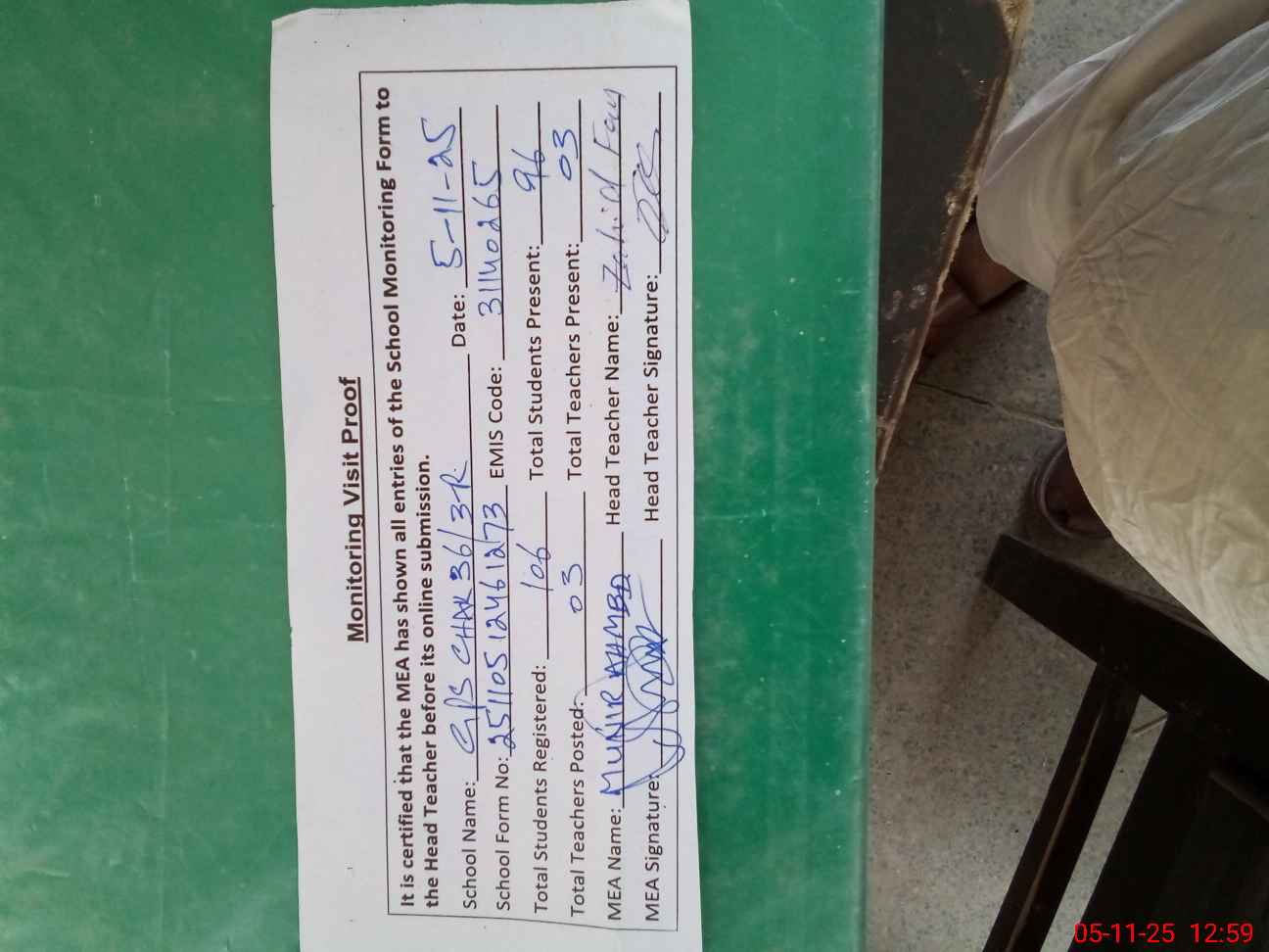 | Attendance Register | Head Teacher | MEA with School | Visit Proof |