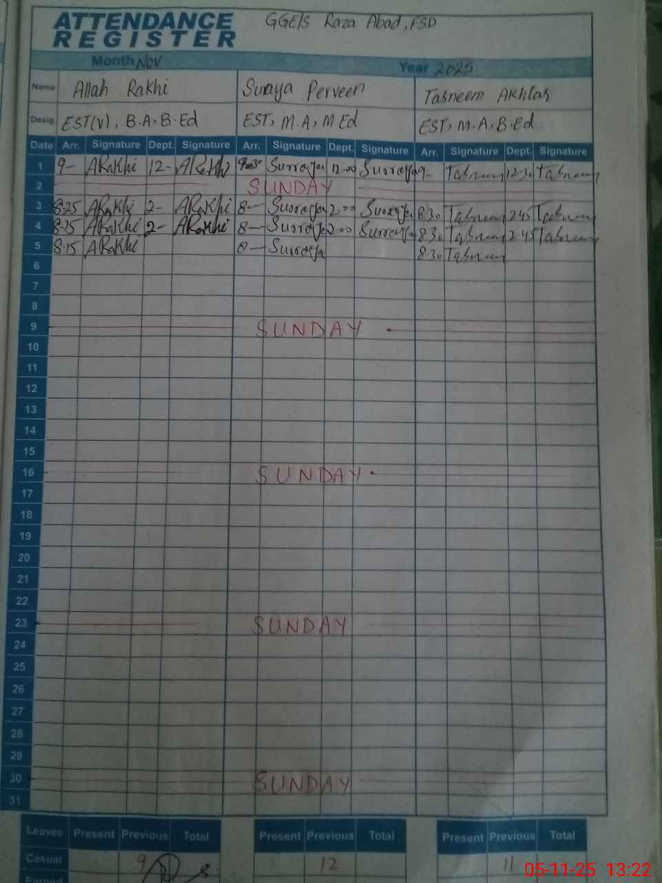 | CNIC | Full Name | Designation | R/C | Absence During Last Calender Month |