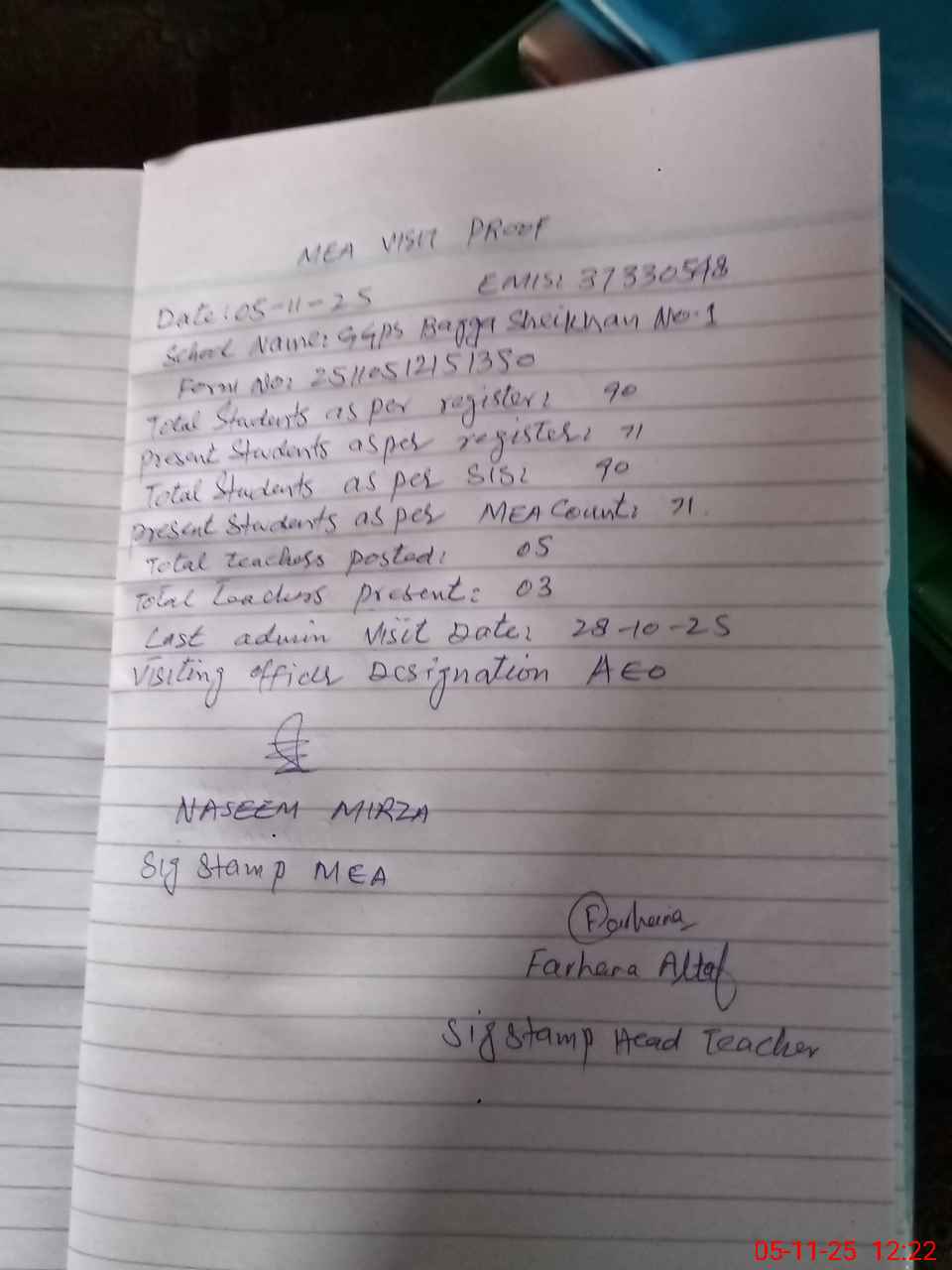 | Attendance Register | Head Teacher | MEA with School | Visit Proof |