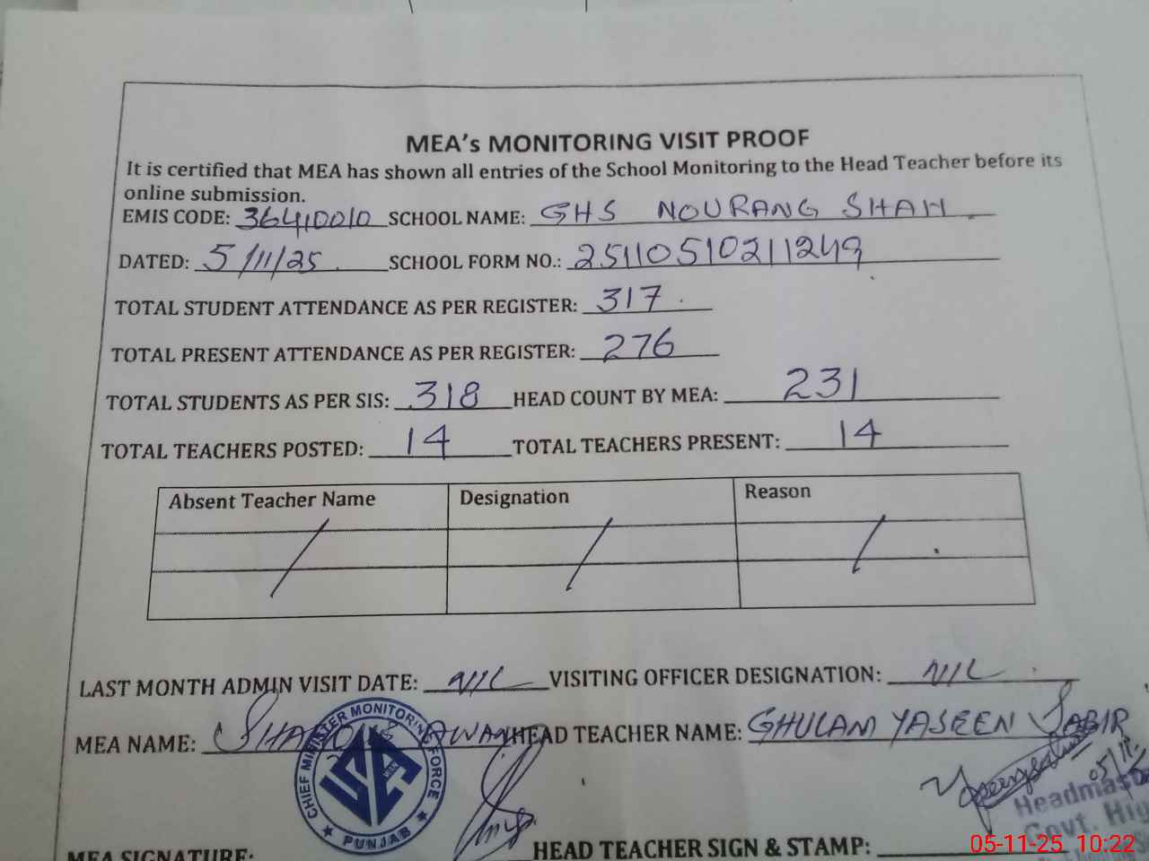 | Attendance Register | Head Teacher | MEA with School | Visit Proof |