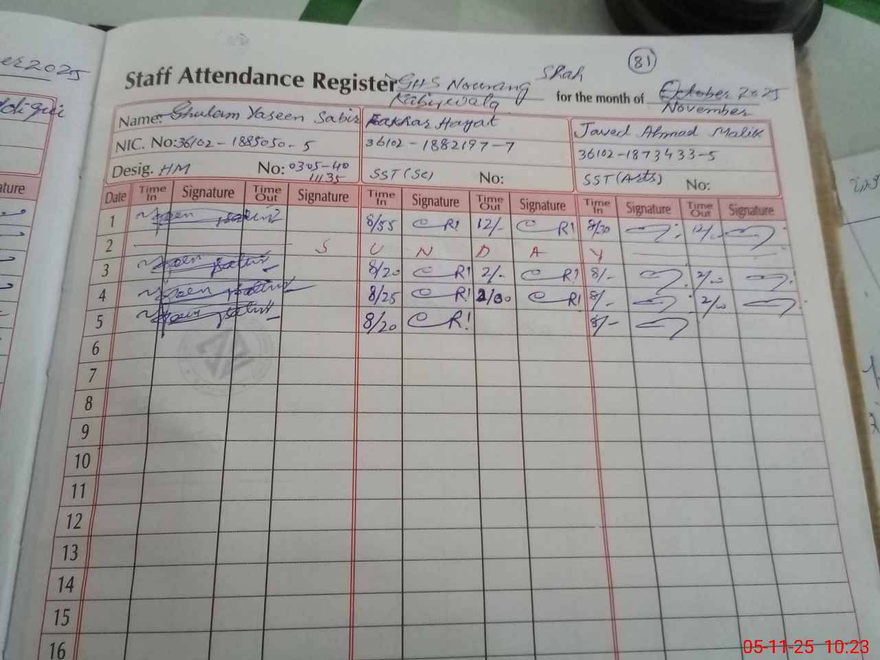 | CNIC | Full Name | Designation | R/C | Absence During Last Calender Month |