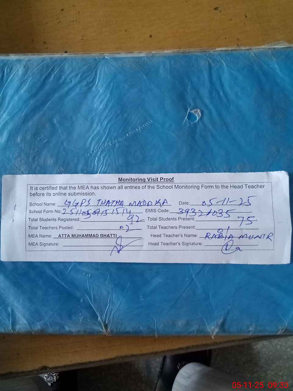 | Attendance Register | Head Teacher | MEA with School | Visit Proof |