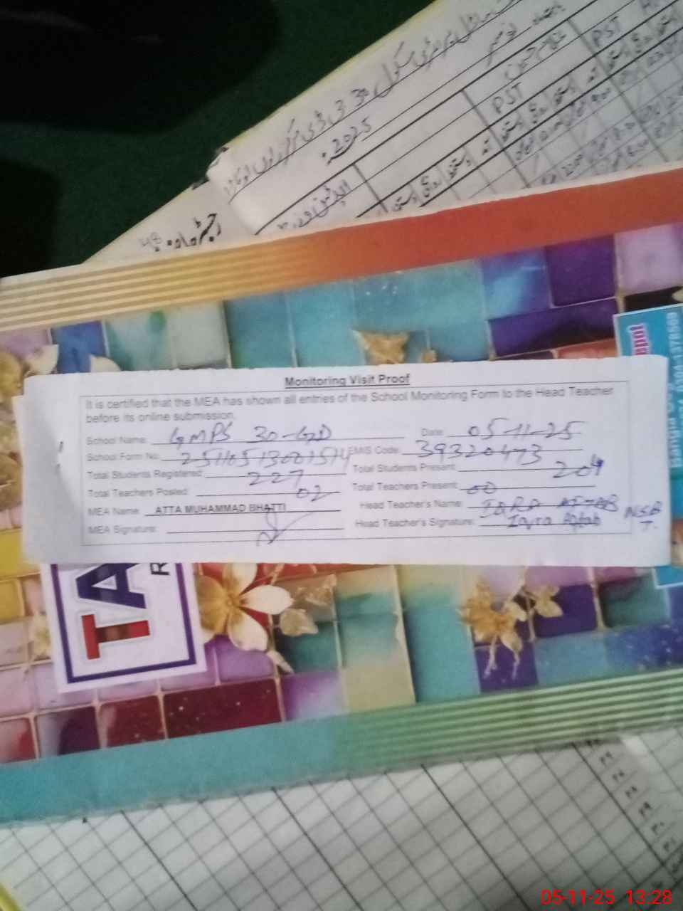 | Attendance Register | Head Teacher | MEA with School | Visit Proof |
