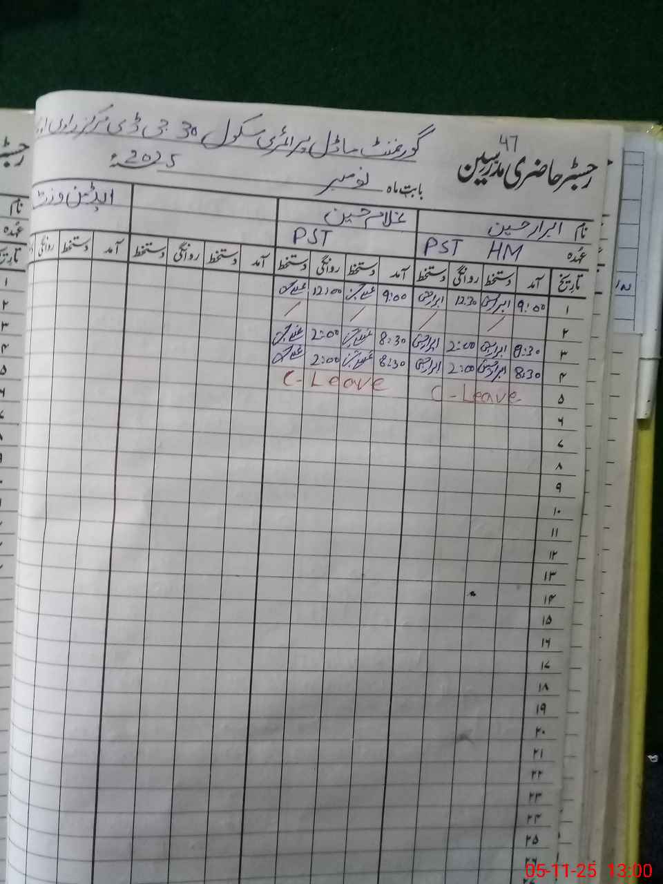 | CNIC | Full Name | Designation | R/C | Absence During Last Calender Month |