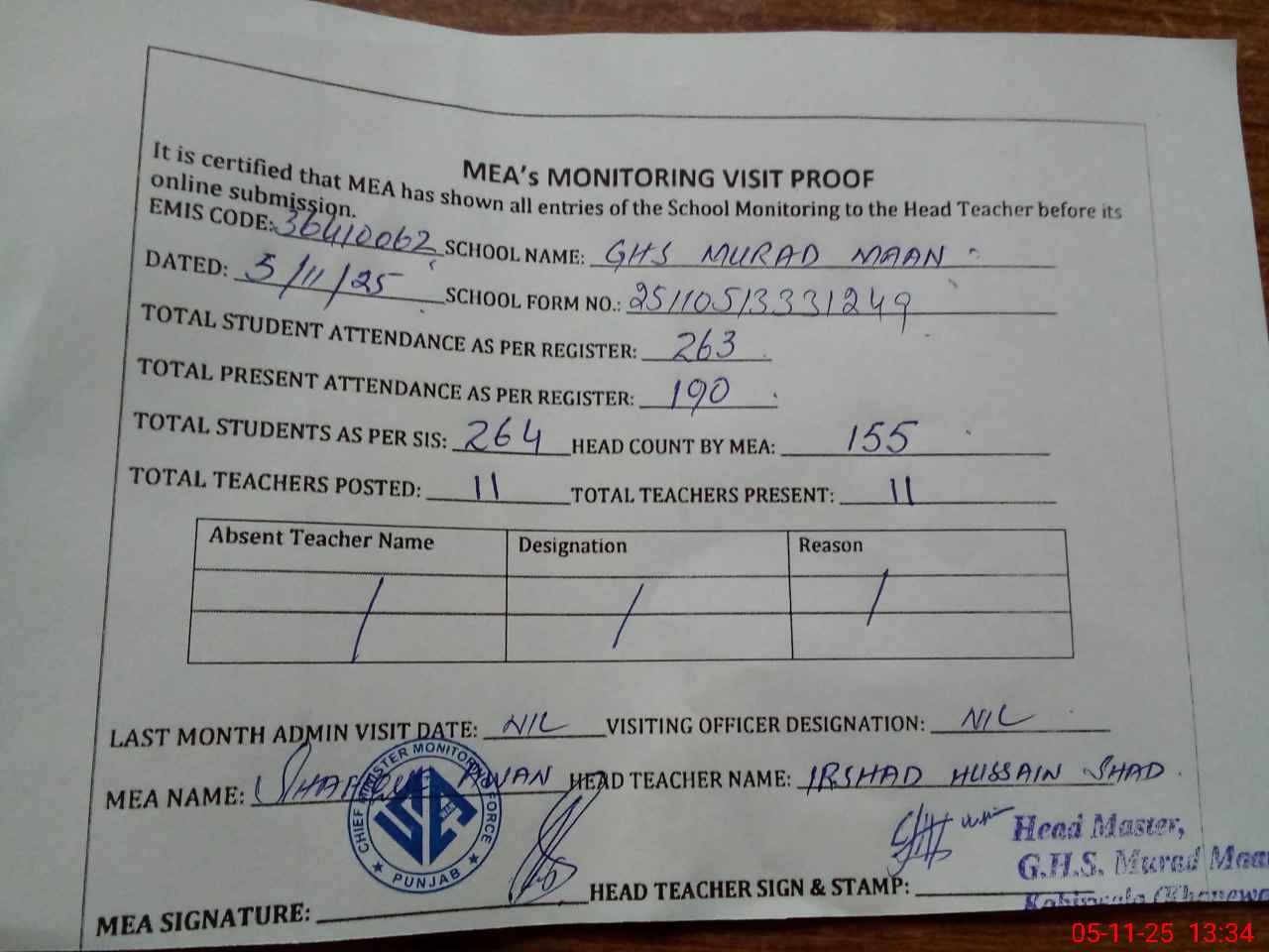| Attendance Register | Head Teacher | MEA with School | Visit Proof |
