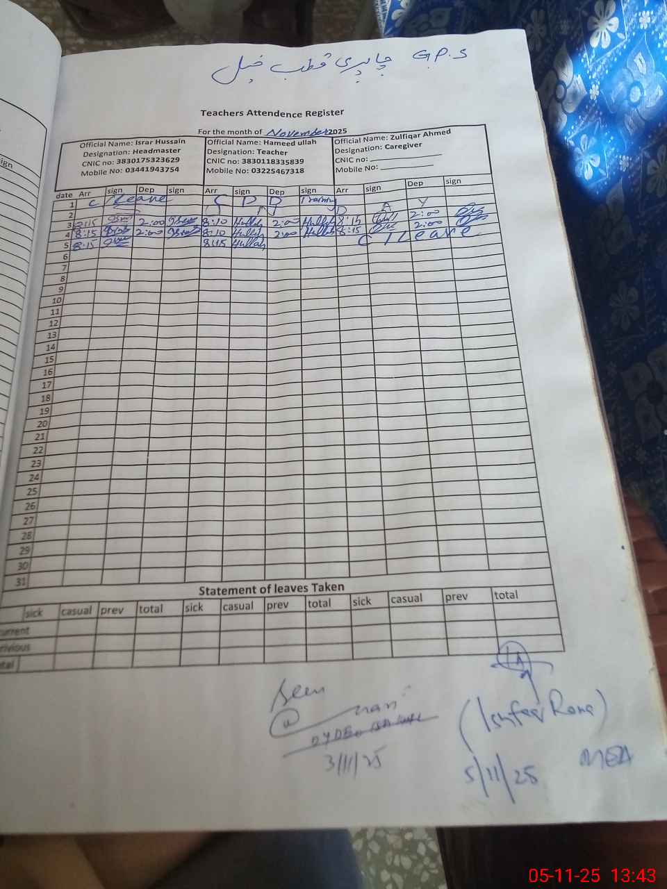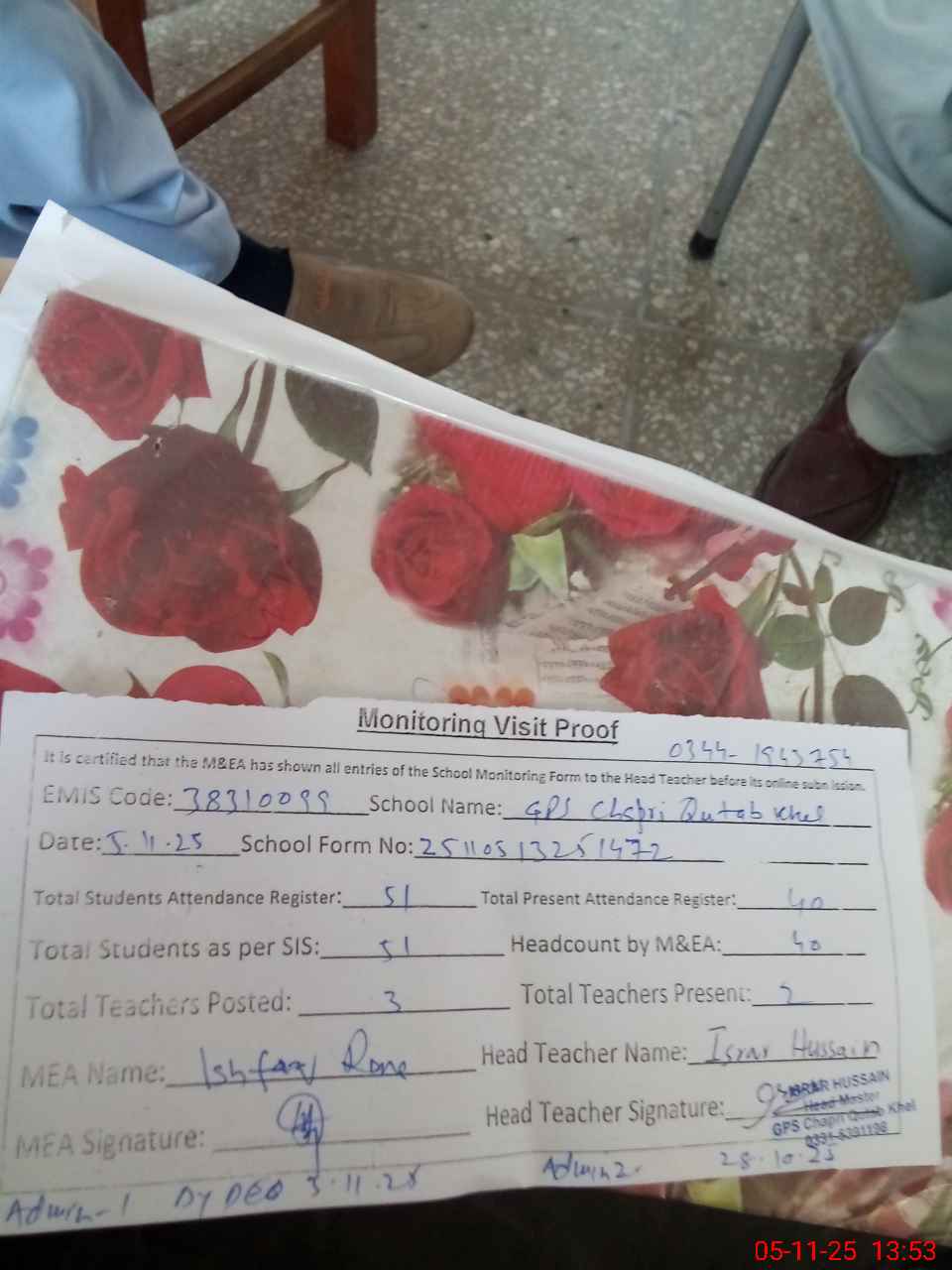 | Name: Is**** Hu**** Designation: (School Headmaster's/Headmistress's) HEADMASTER Phone/Cell Number: 03**** |