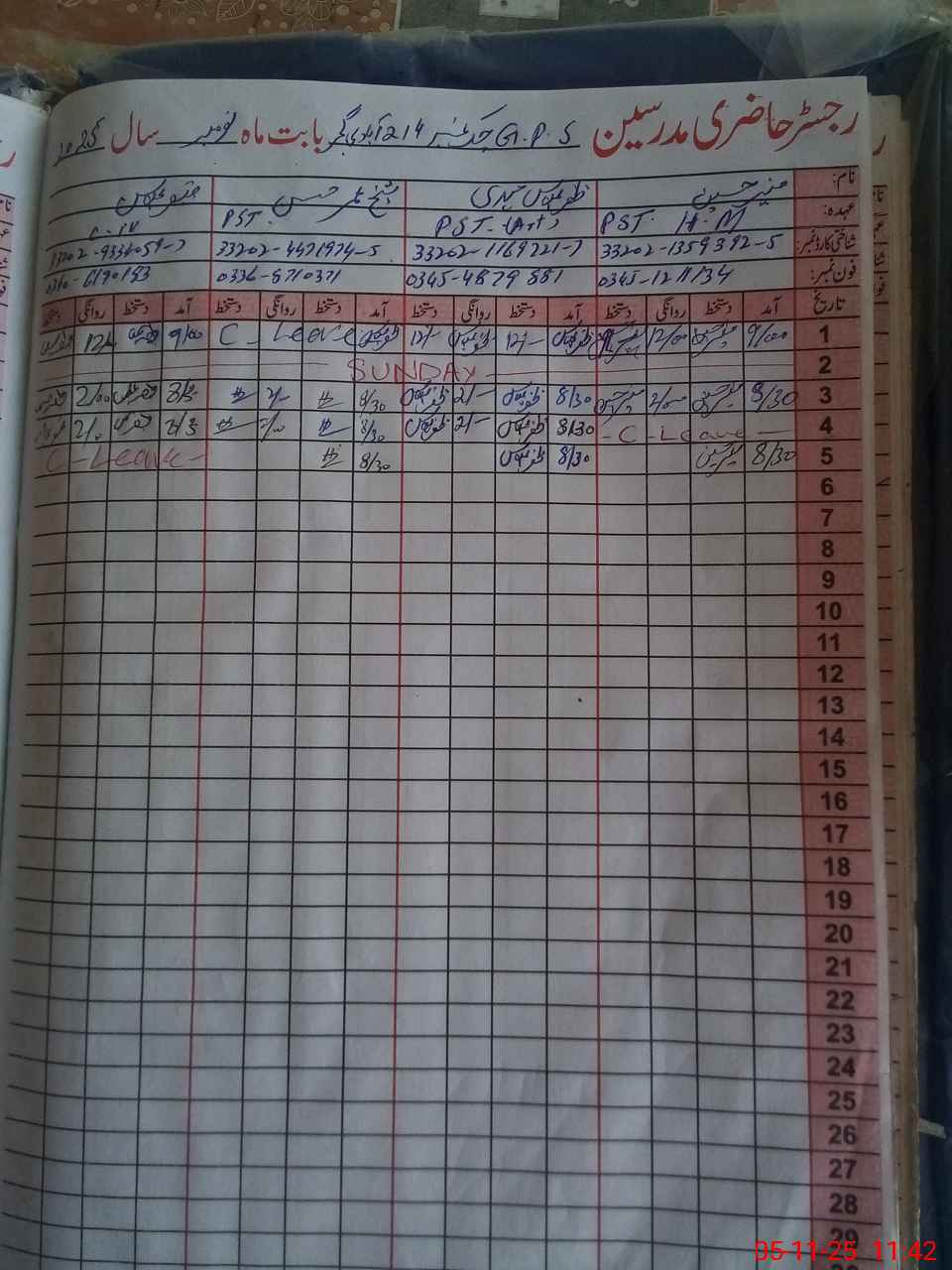 | CNIC | Full Name | Designation | R/C | Absence During Last Calender Month |