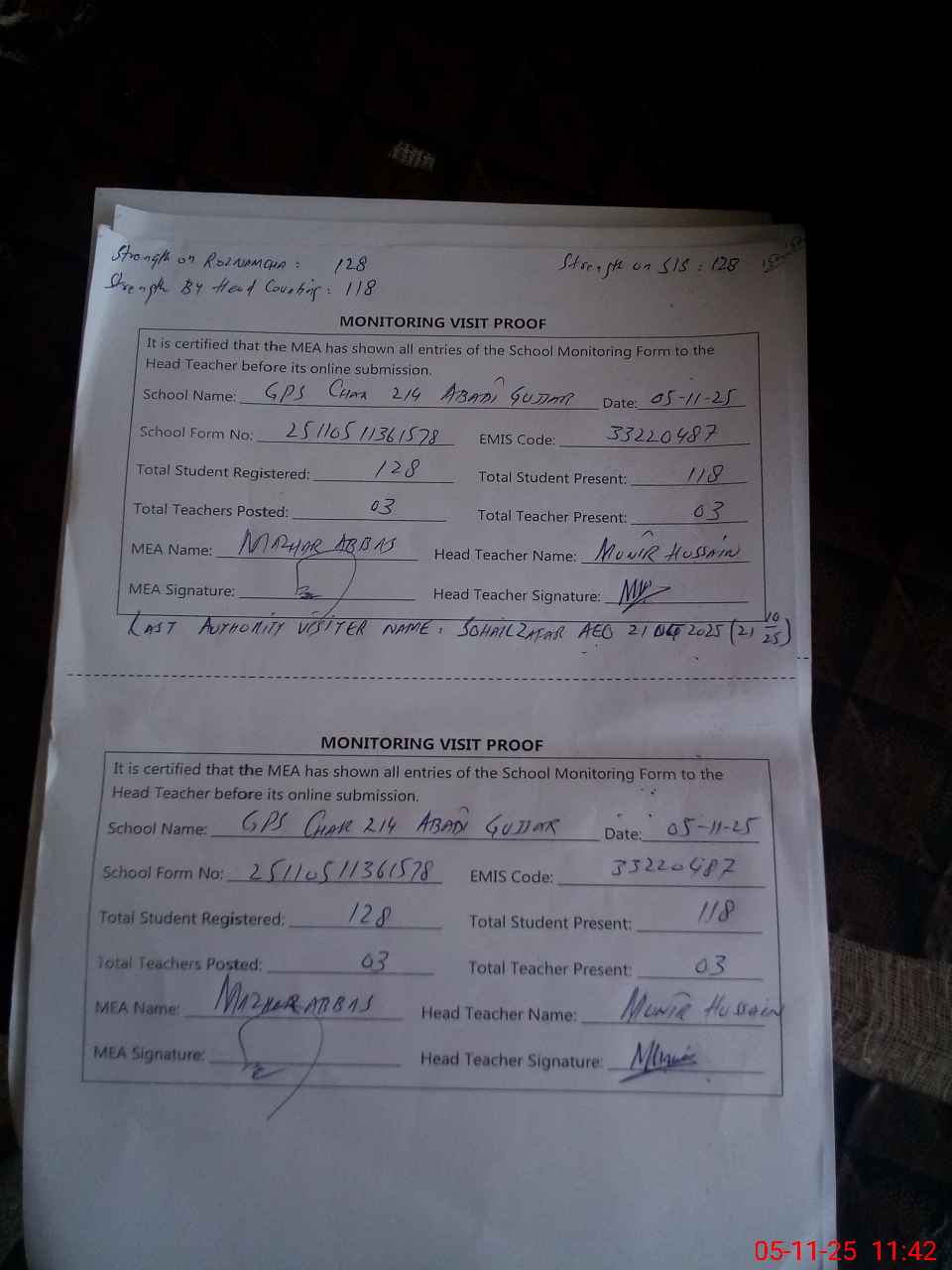 | Attendance Register | Head Teacher | MEA with School | Visit Proof |