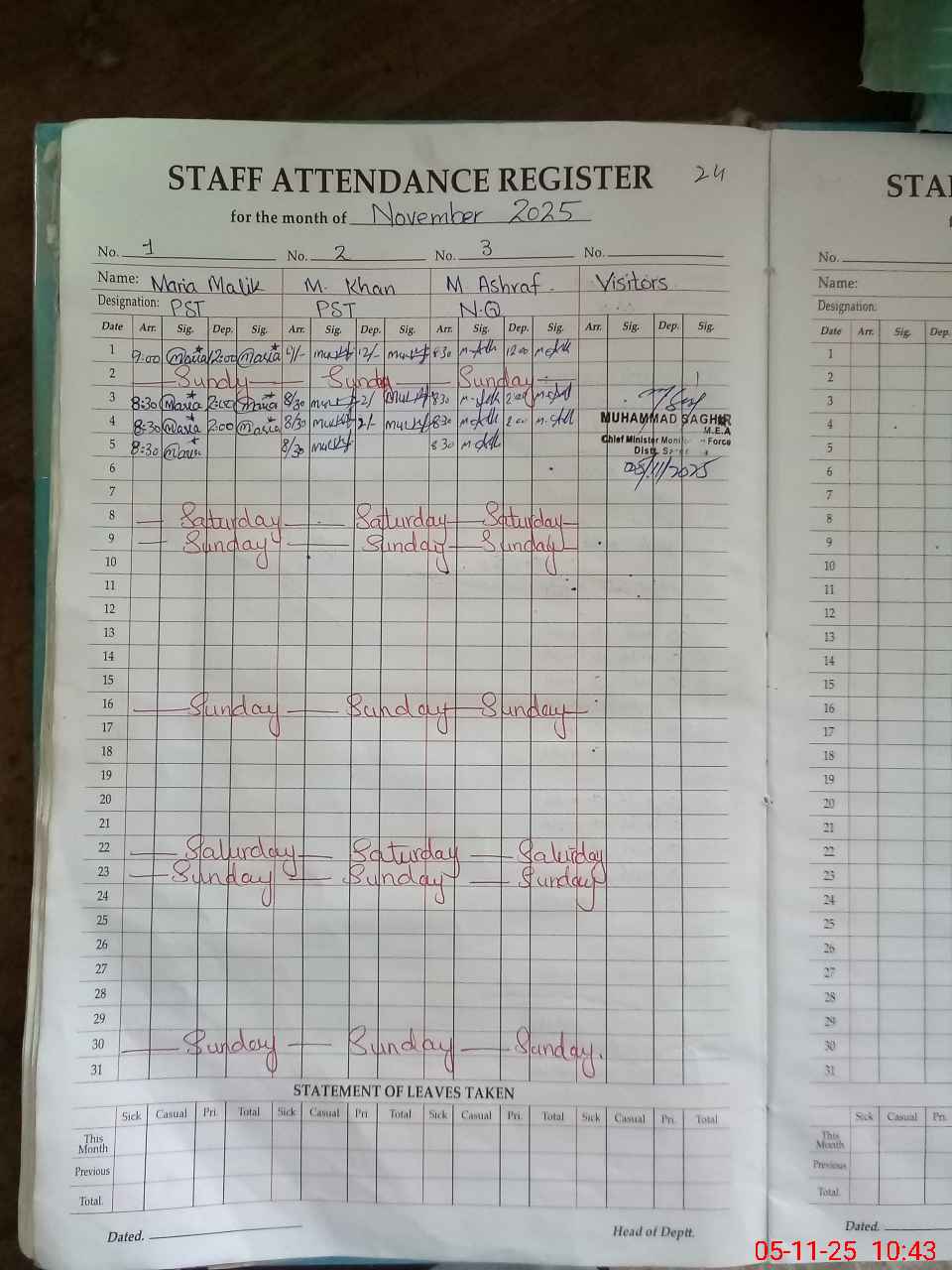 | Leave | Duty | Absent | Maternity | Medical | Ex- Pak |
