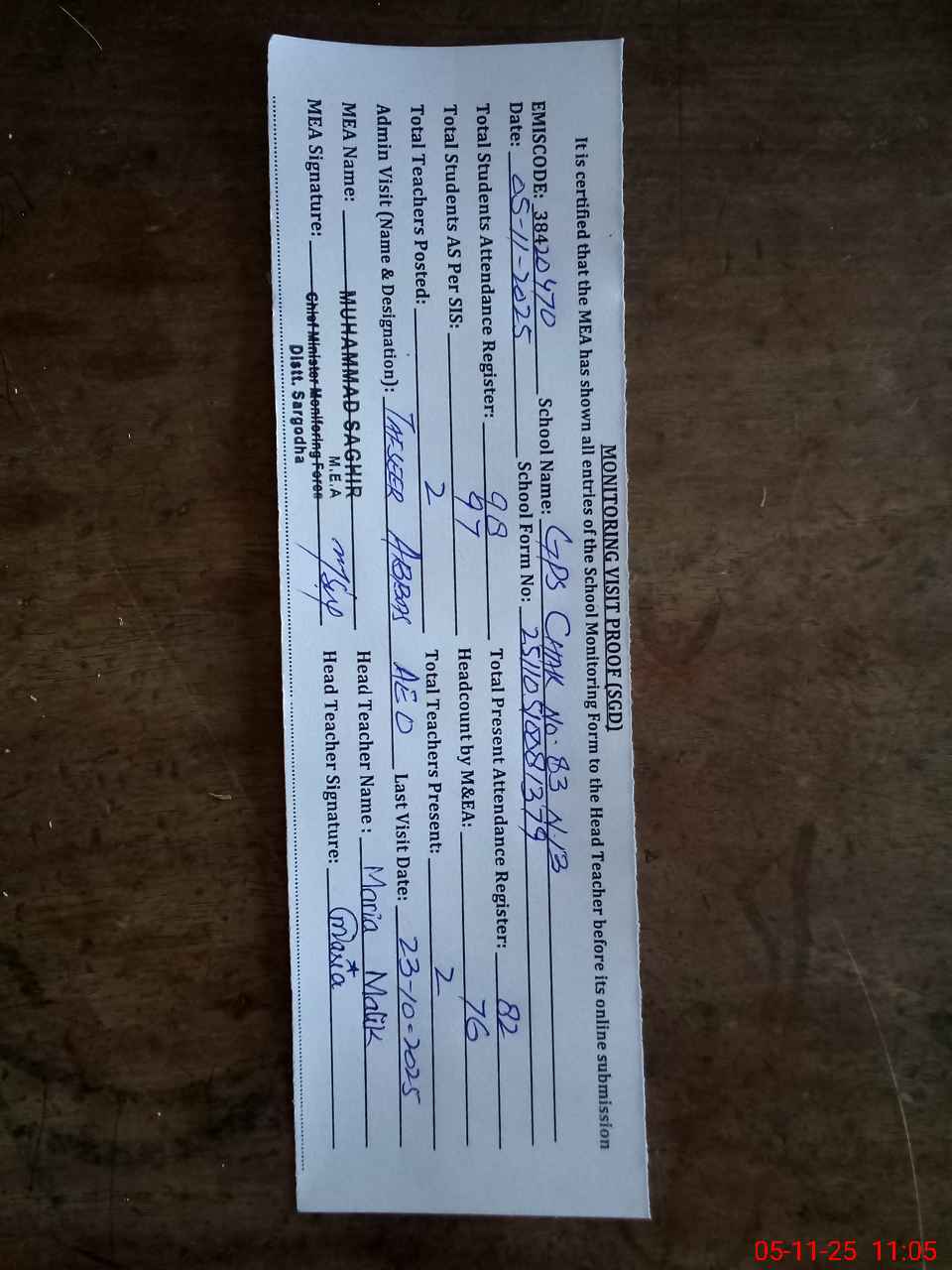 | Attendance Register | Head Teacher | MEA with School | Visit Proof |