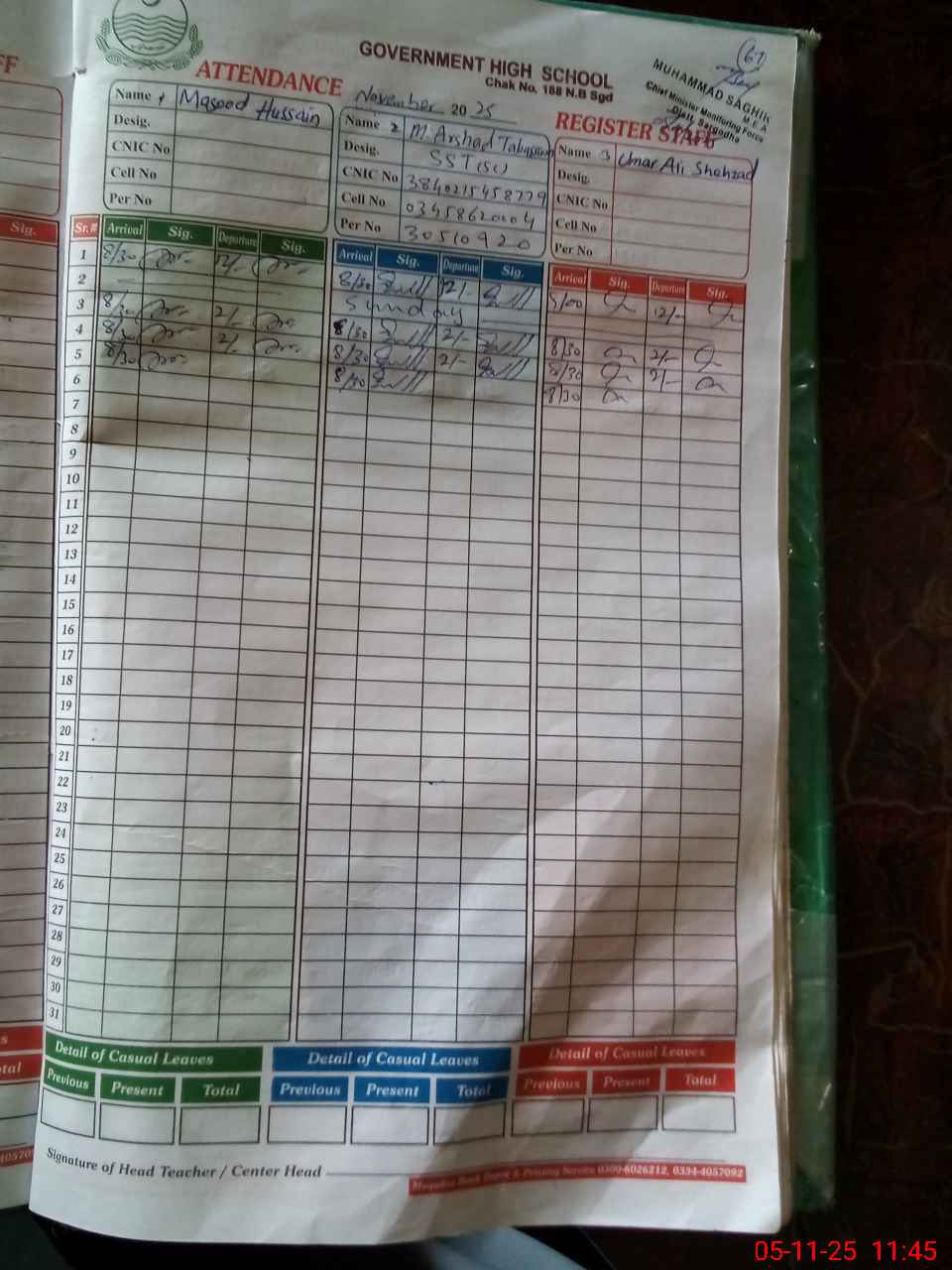 | CNIC | Full Name | Designation | R/C | Absence During Last Calender Month |