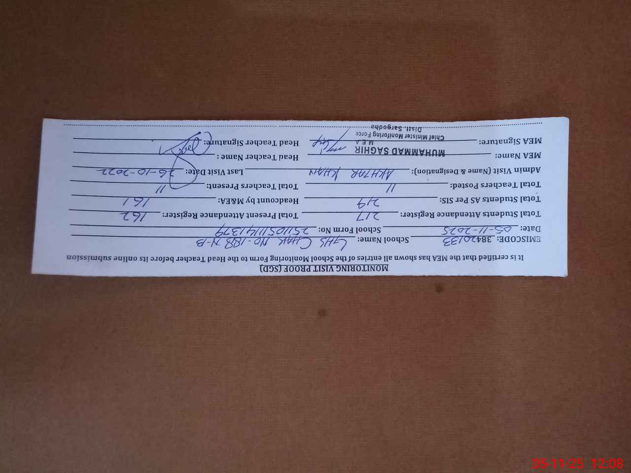| Attendance Register | Head Teacher | MEA with School | Visit Proof |