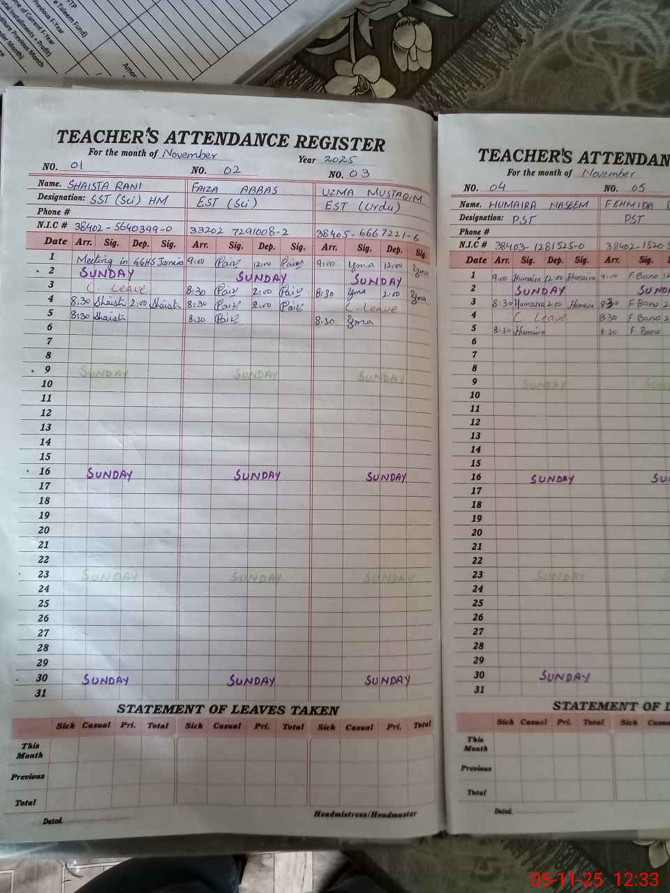 | CNIC | Full Name | Designation | R/C | Absence During Last Calender Month |