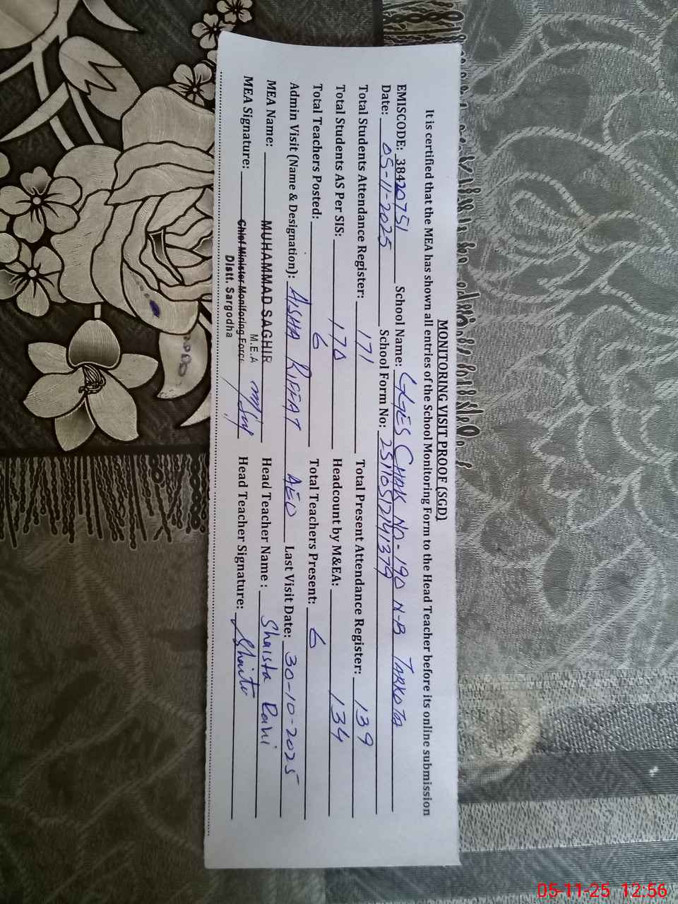 | Attendance Register | Head Teacher | MEA with School | Visit Proof |