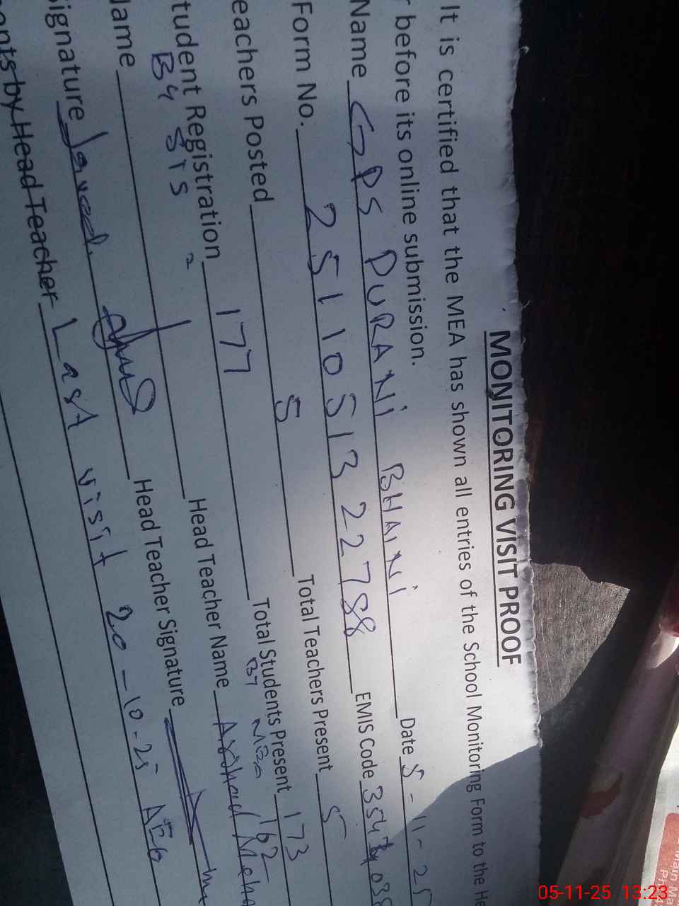 | Name: AR**** ME**** Designation: (School Headmaster's/Headmistress's) PST/PTC/JV Phone/Cell Number: 03**** |