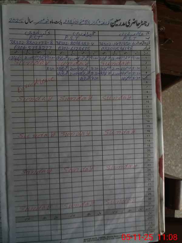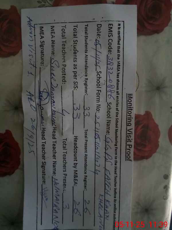 | Remarks (Use Separate Page if Required): PST ZAKIA PARVEEN was unauthorized her leave was waiting for approval of DEO and AEO has not visit the school during the month of September 2025 | |||||