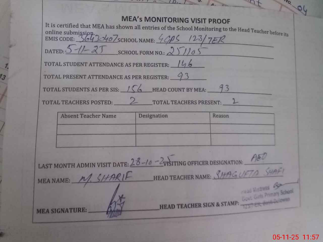 | Attendance Register | Head Teacher | MEA with School | Visit Proof |