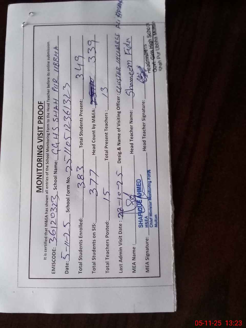 | EMIS Code: 36120323 | Name of School: GGHS SHAH PUR UBBHA SHUJABAD | |||