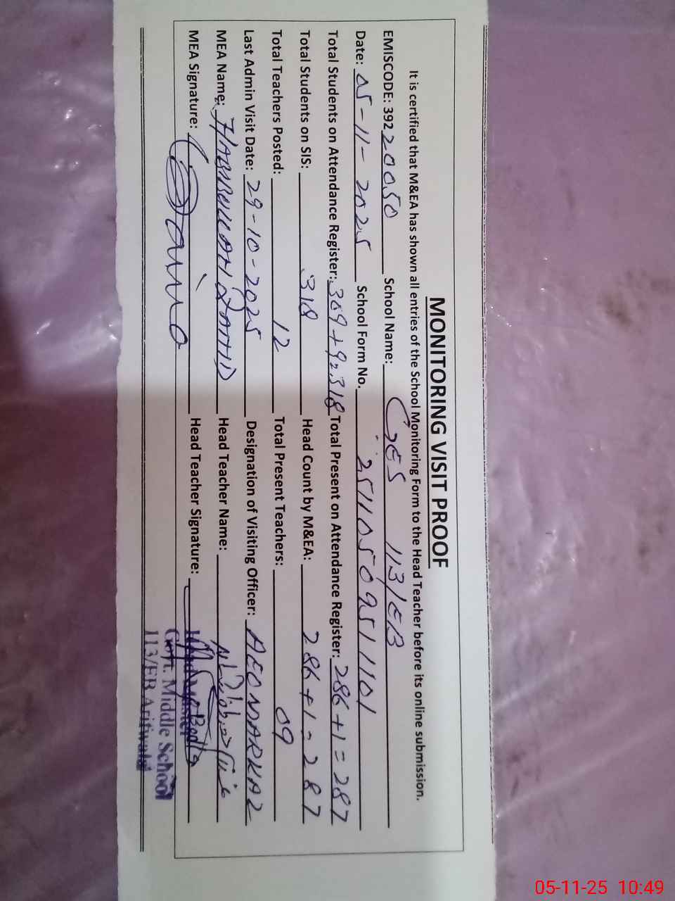 | Attendance Register | Head Teacher | MEA with School | Visit Proof |