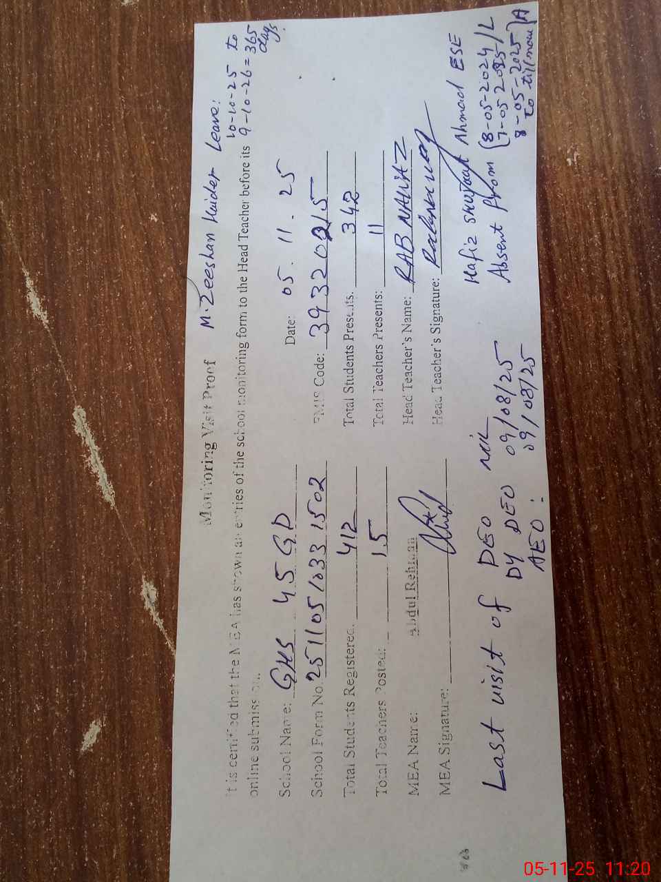 | Remarks (Use Separate Page if Required): Last visit of AEO and Dy DEO is on 09 August 2025 No visit of DEO Hafiz shujaat Ahmad absent from 08 May 2024 to till now | |||||