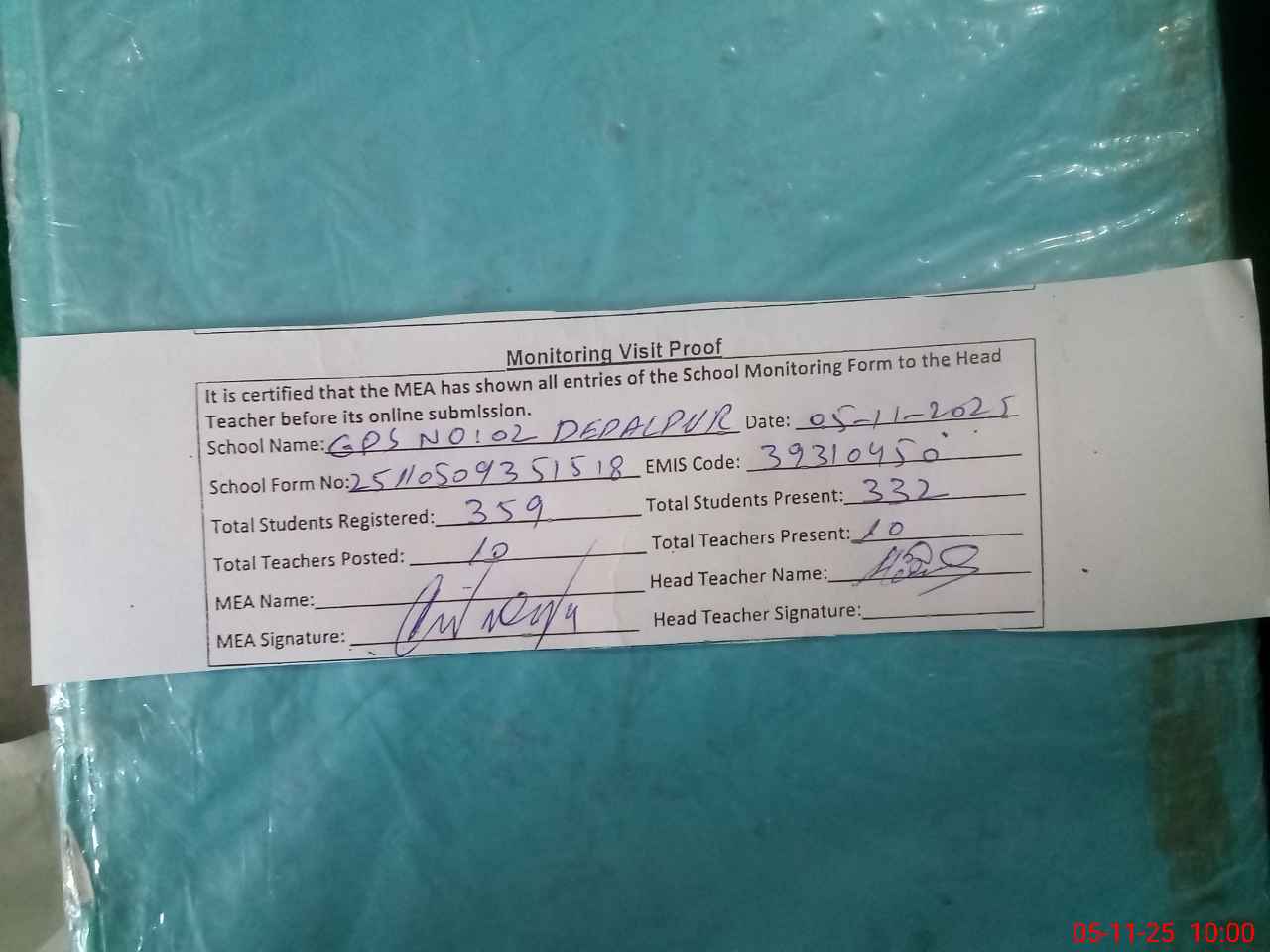 | Attendance Register | Head Teacher | MEA with School | Visit Proof |