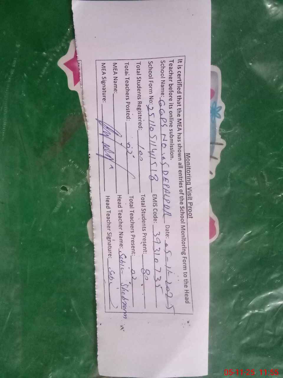 | Attendance Register | Head Teacher | MEA with School | Visit Proof |