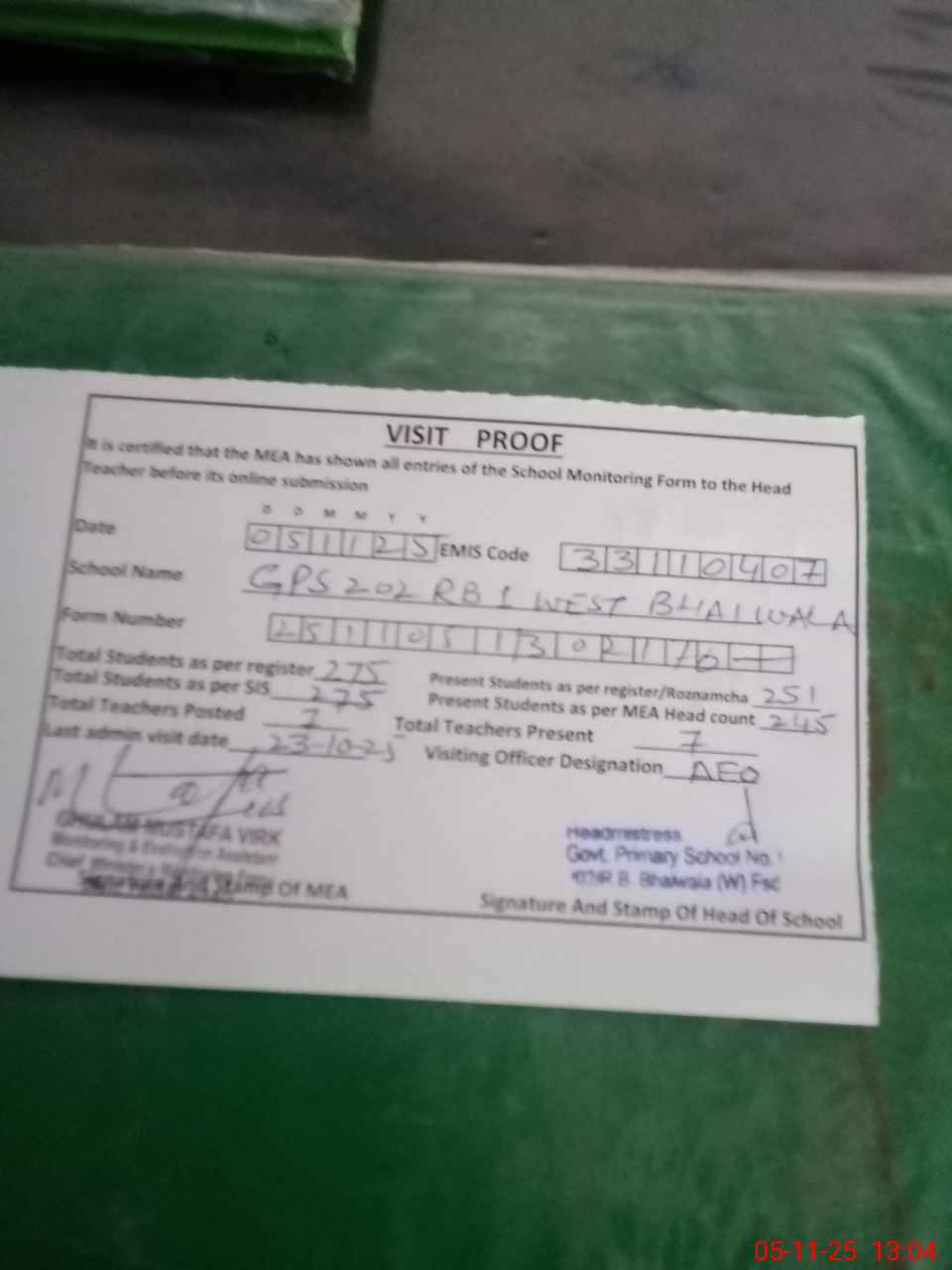 | Attendance Register | Head Teacher | MEA with School | Visit Proof |