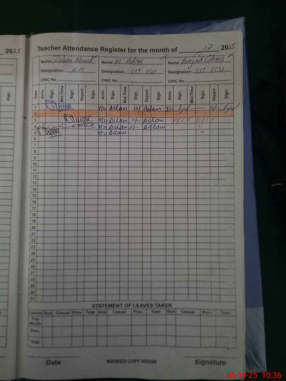 | CNIC | Full Name | Designation | R/C | Absence During Last Calender Month |