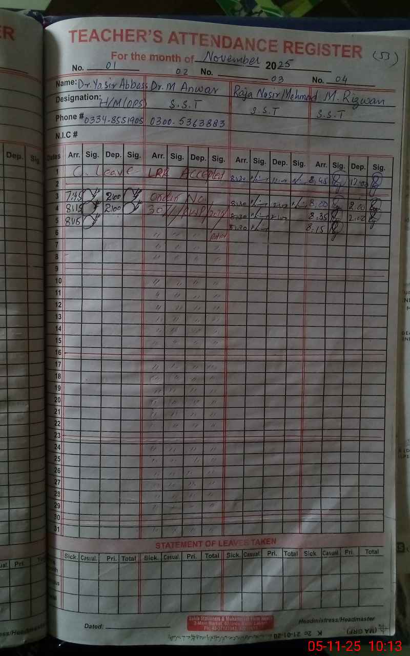 | CNIC | Full Name | Designation | R/C | Absence During Last Calender Month |