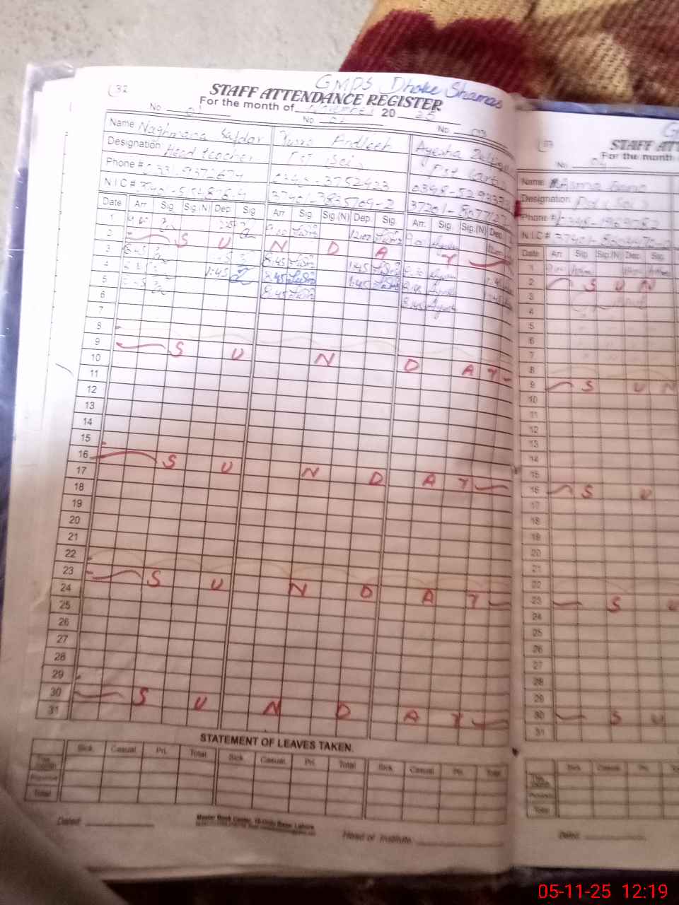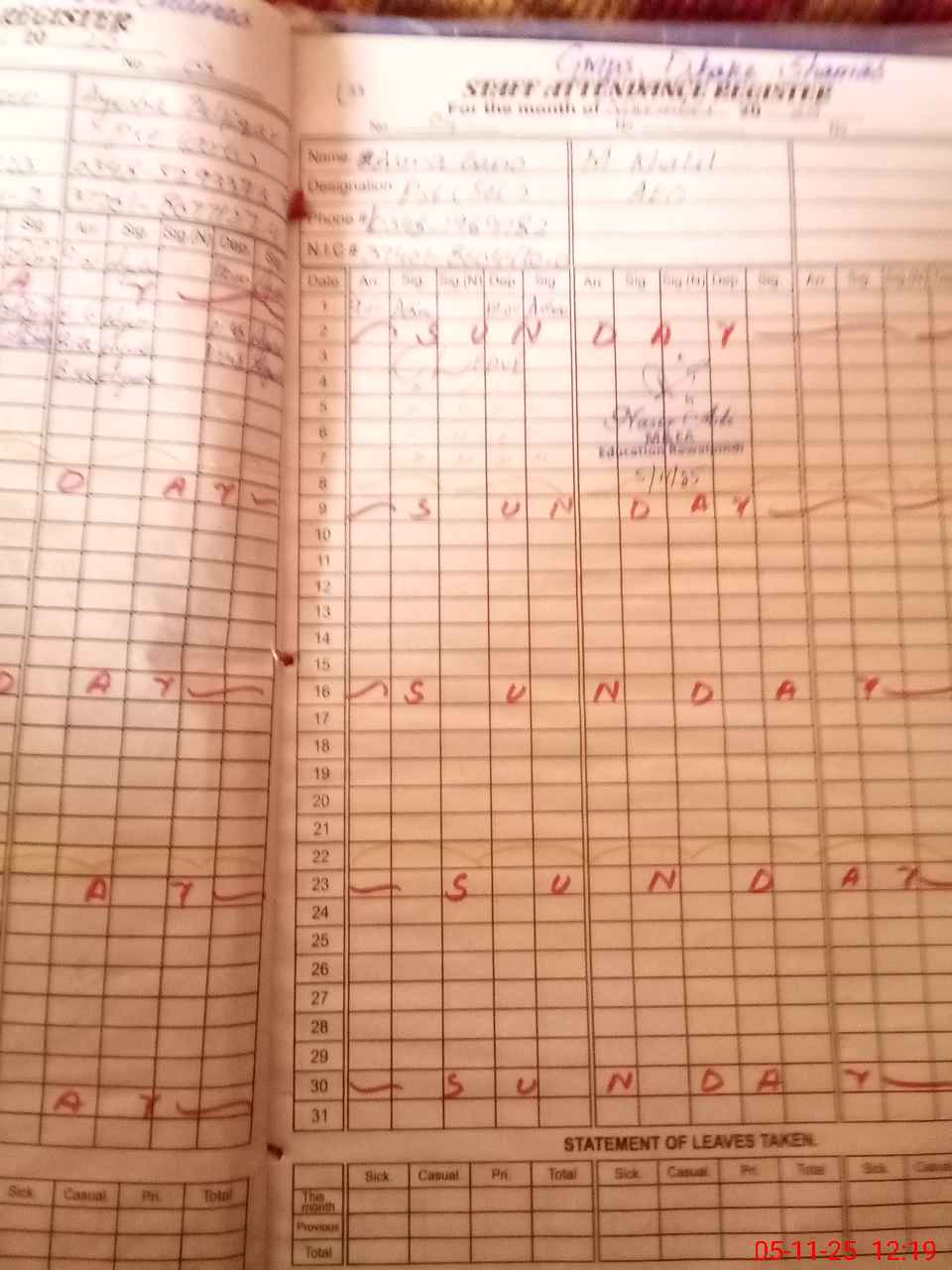 | CNIC | Full Name | Designation | R/C | Absence During Last Calender Month |