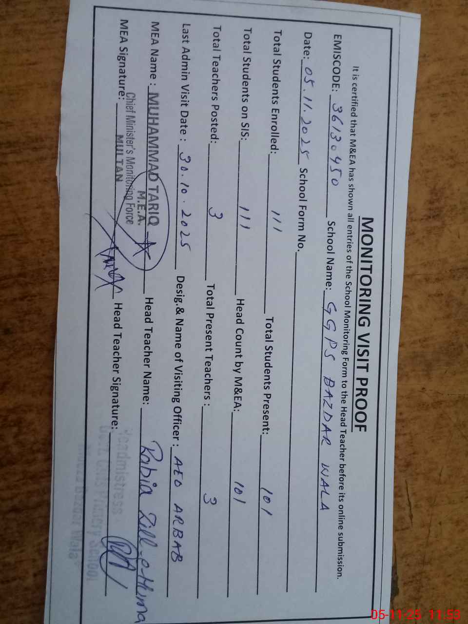 | EMIS Code: 36130450 | Name of School: GGPS BAZDAR WALA MULTAN | |||