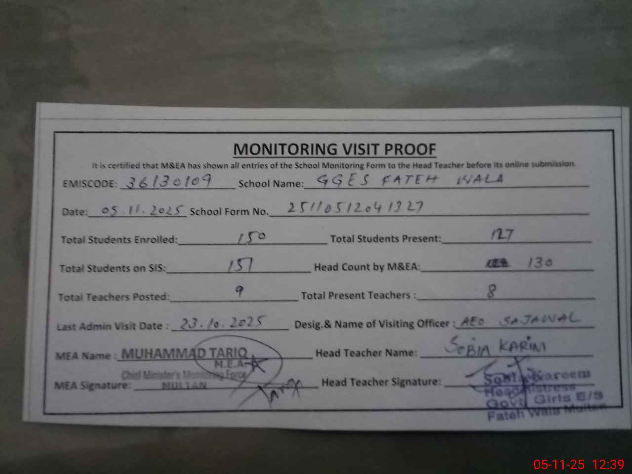 | EMIS Code: 36130109 | Name of School: GGES FATEH WALA MULTAN | |||
