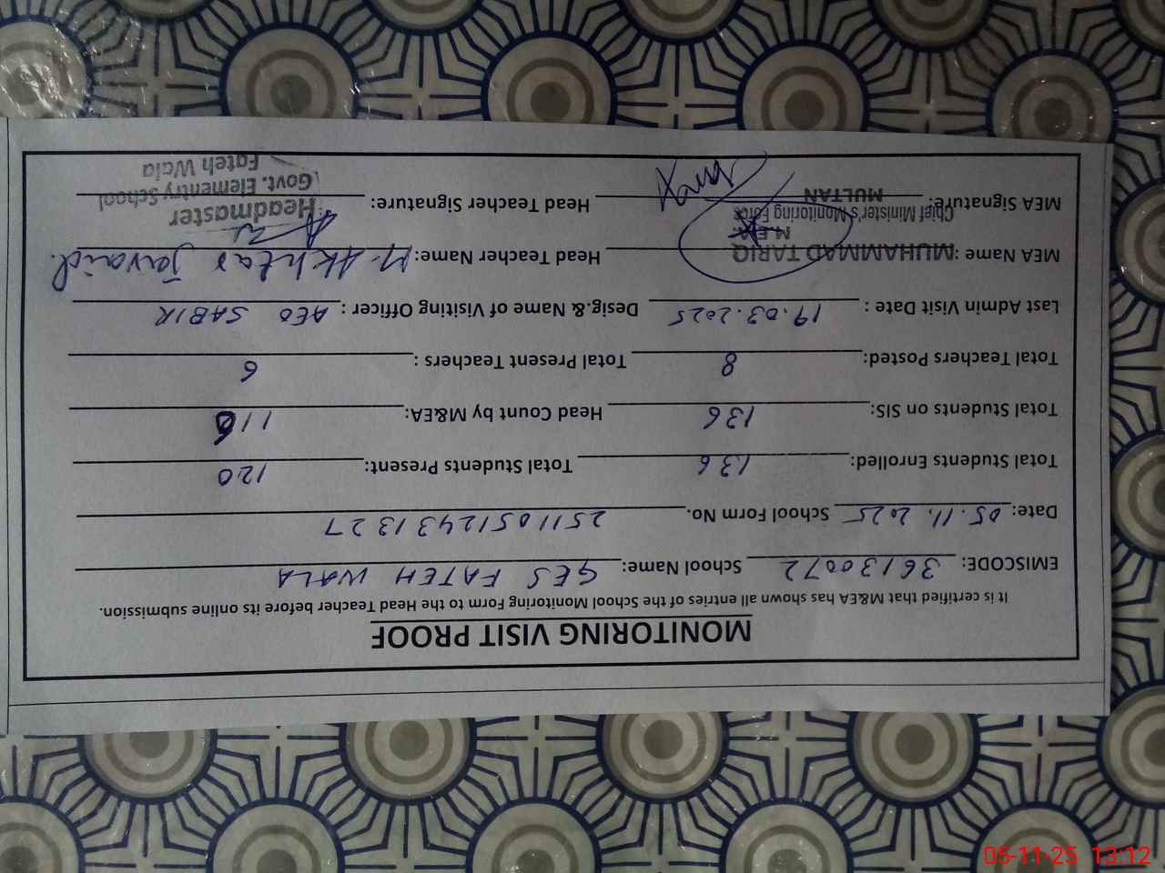 | Attendance Register | Head Teacher | MEA with School | Visit Proof |