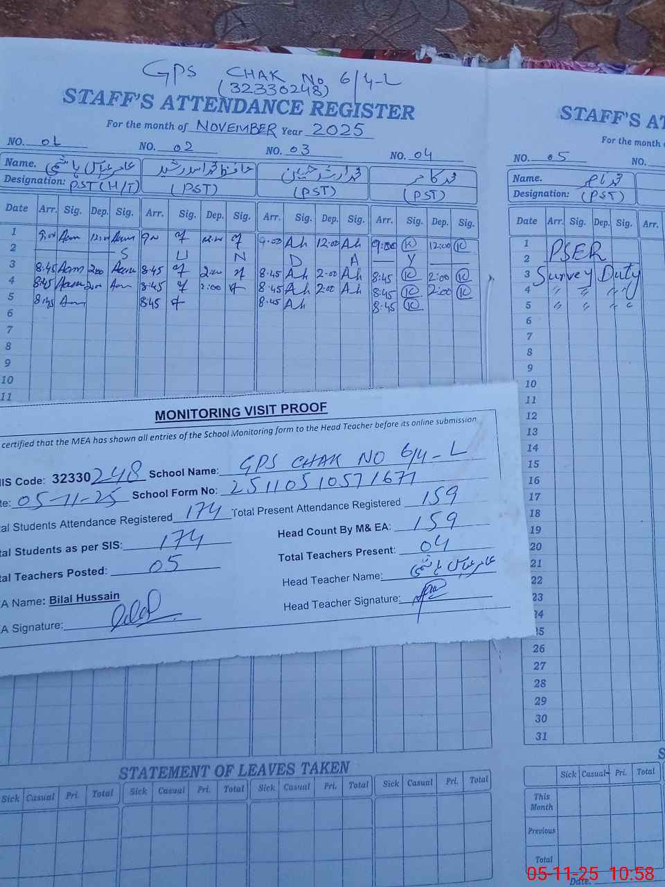 | Attendance Register | Head Teacher | MEA with School | Visit Proof |