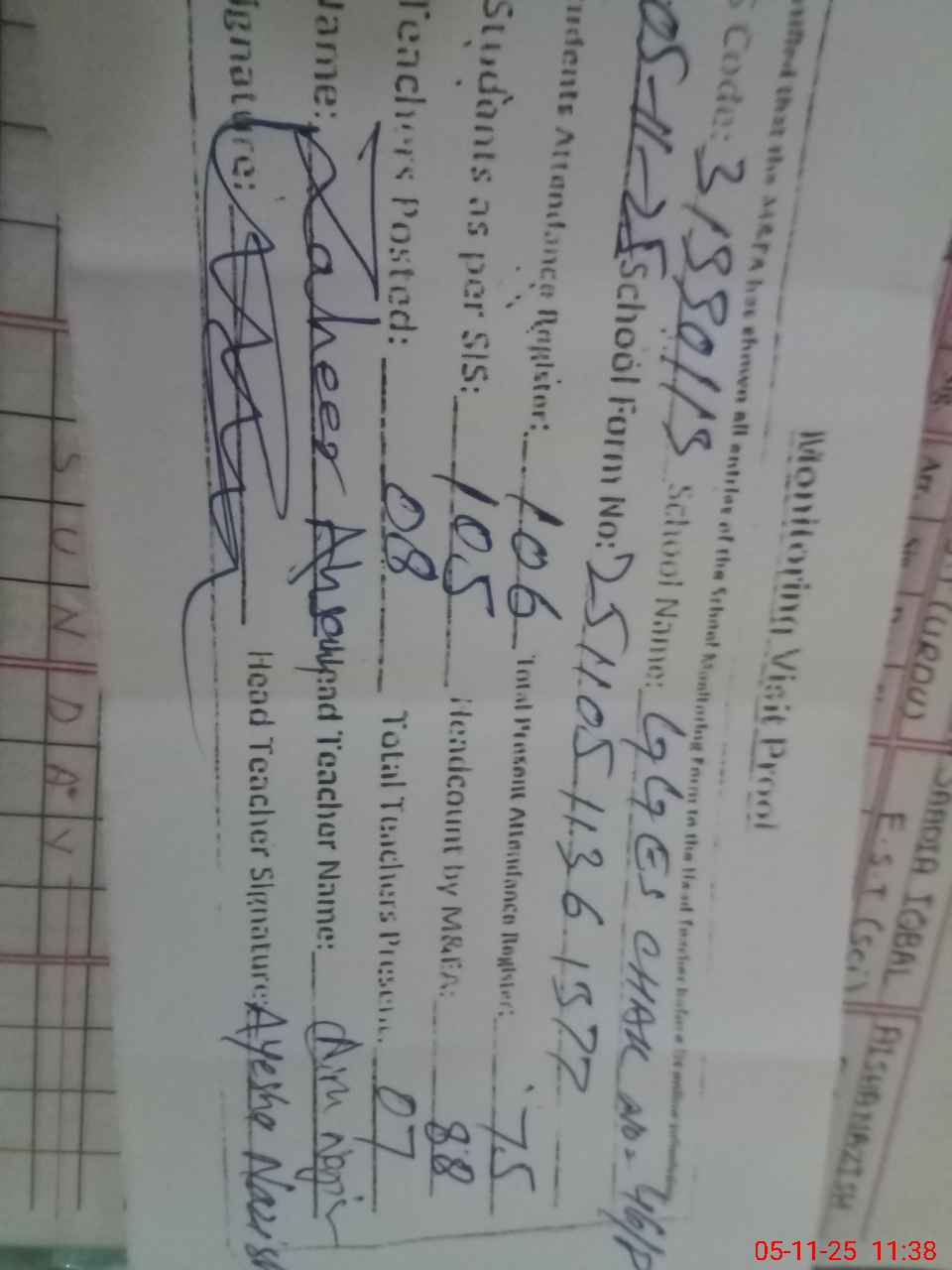 | Monitoring Date: 05-11-2025 | Start Time: 05-11-2025 10:27 AM | End Time: 05-11-2025 11:42 AM | Name of MEA: Za**** Ah**** | |