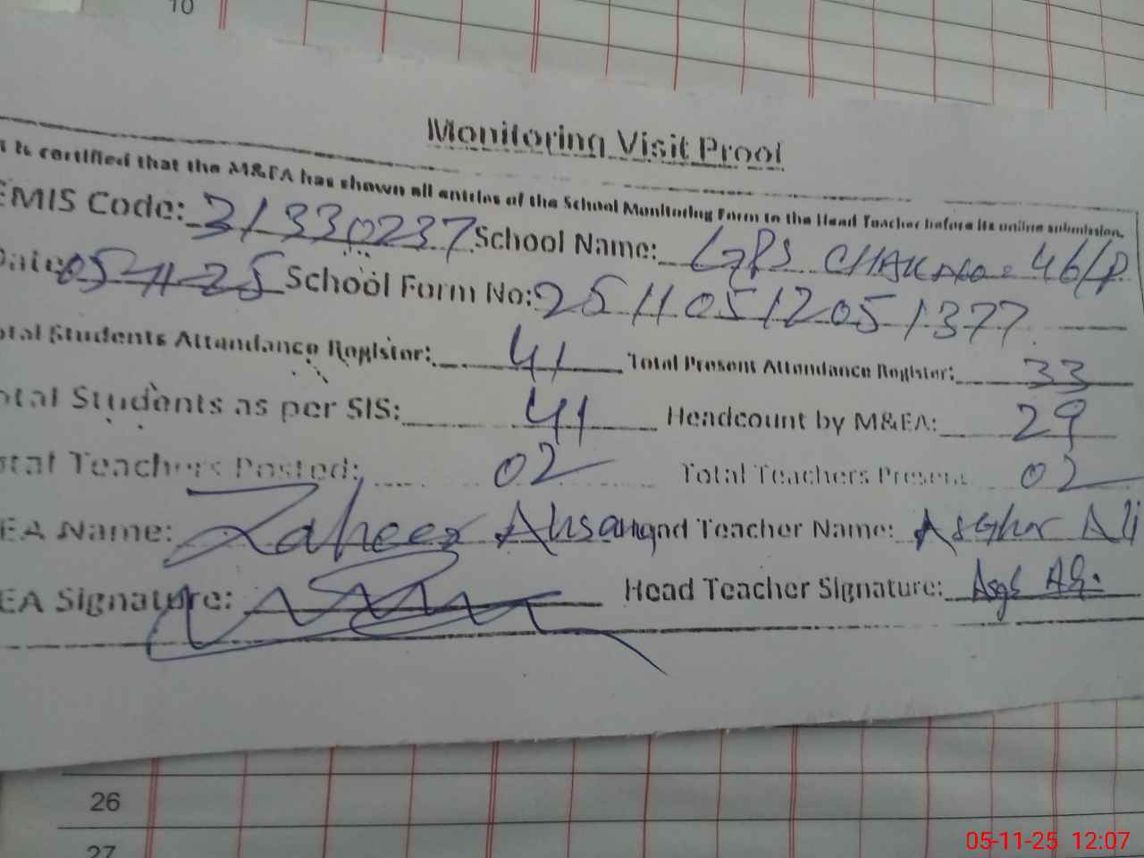 | Attendance Register | Head Teacher | MEA with School | Visit Proof |