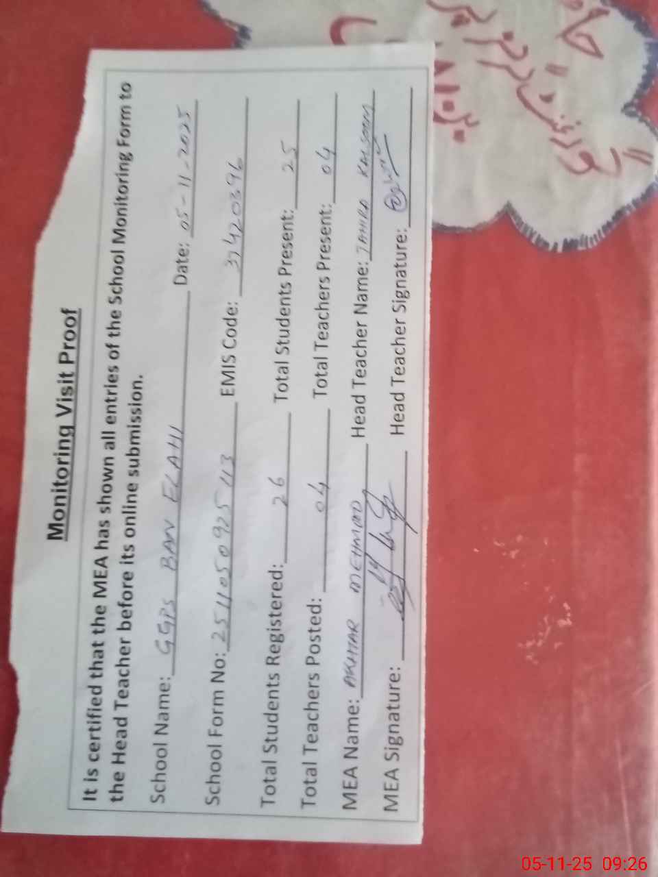 | Attendance Register | Head Teacher | MEA with School | Visit Proof |