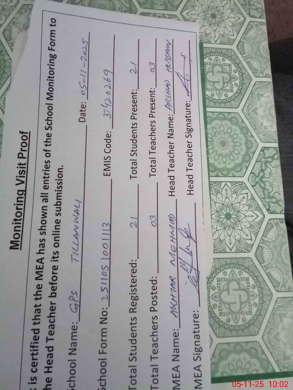 | Attendance Register | Head Teacher | MEA with School | Visit Proof |