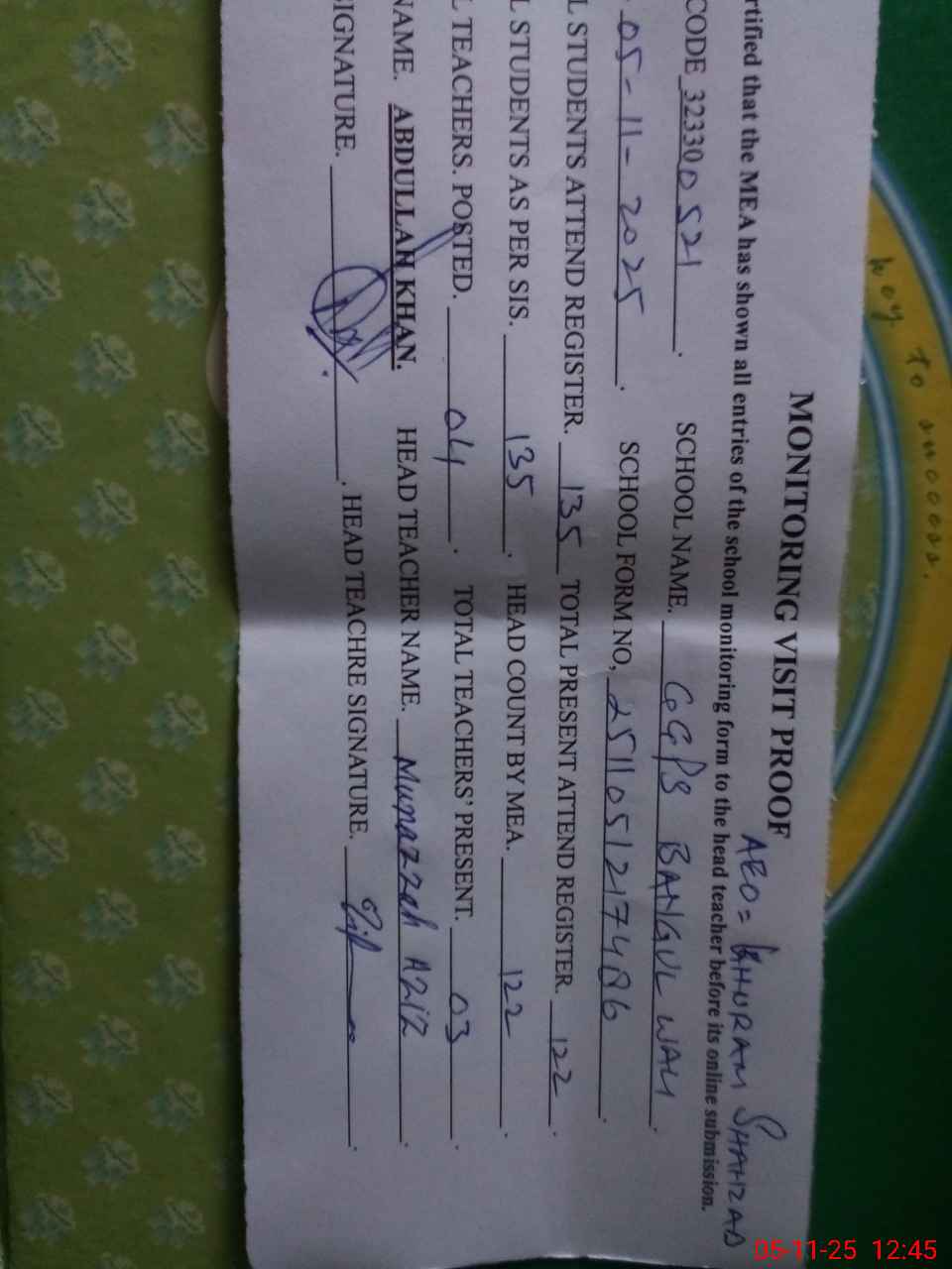 | EMIS Code: 32330521 | Name of School: GGPS BANGUL WALI | |||