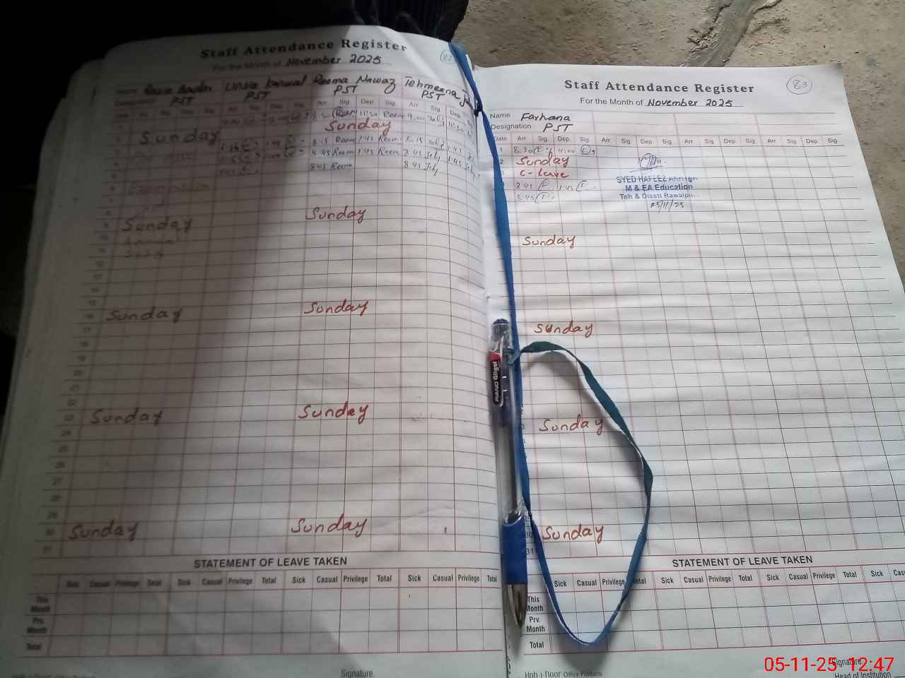 | CNIC | Full Name | Designation | R/C | Absence During Last Calender Month |