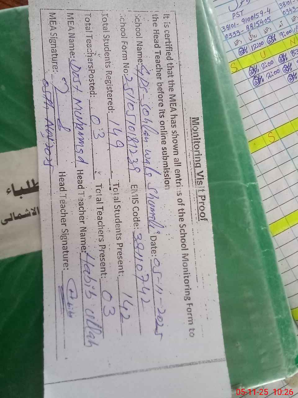 | Remarks (Use Separate Page if Required): All the entered data loudly share with the head teacher before submitting Last visited the subject school by Educational Authority Muddassar Iqbal AEO Dated 24th October 2025 | |||||