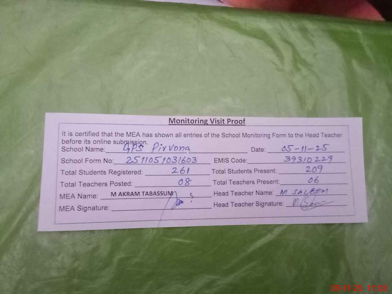 | Attendance Register | Head Teacher | MEA with School | Visit Proof |