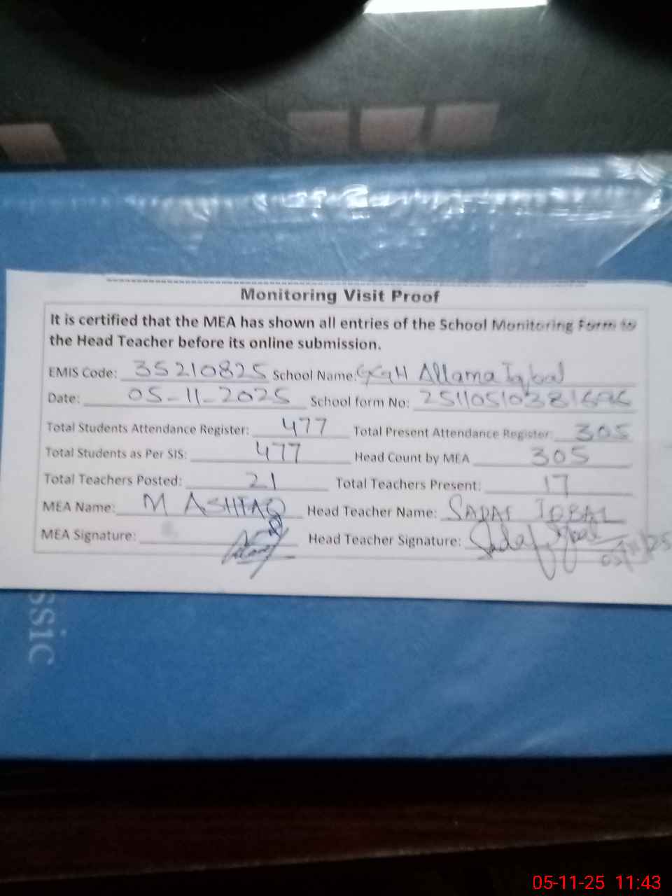 | Attendance Register | Head Teacher | MEA with School | Visit Proof |