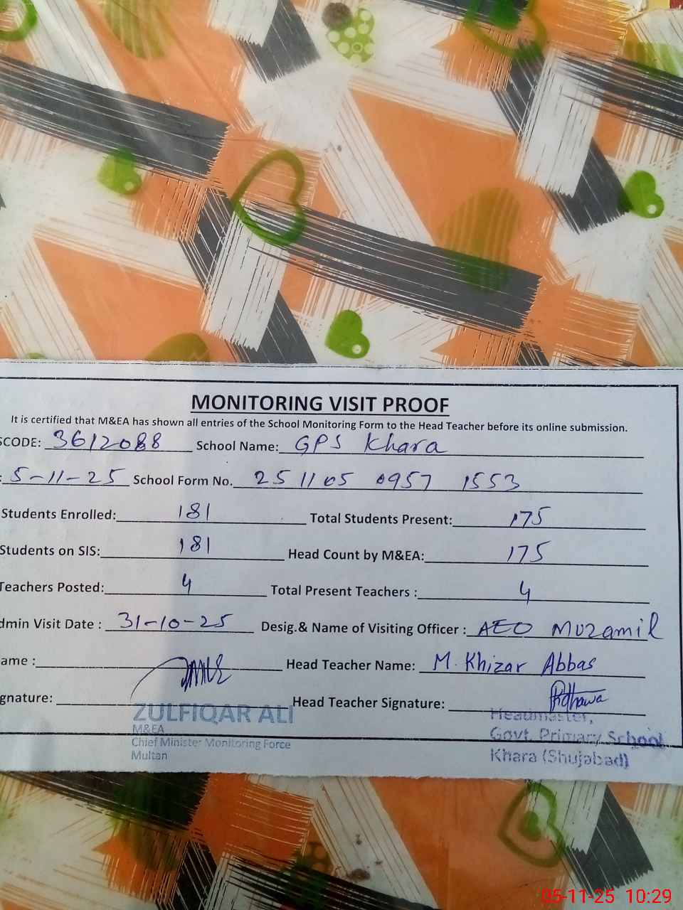 | Monitoring Date: 05-11-2025 | Start Time: 05-11-2025 09:57 AM | End Time: 05-11-2025 10:32 AM | Name of MEA: Zu**** Al**** | |