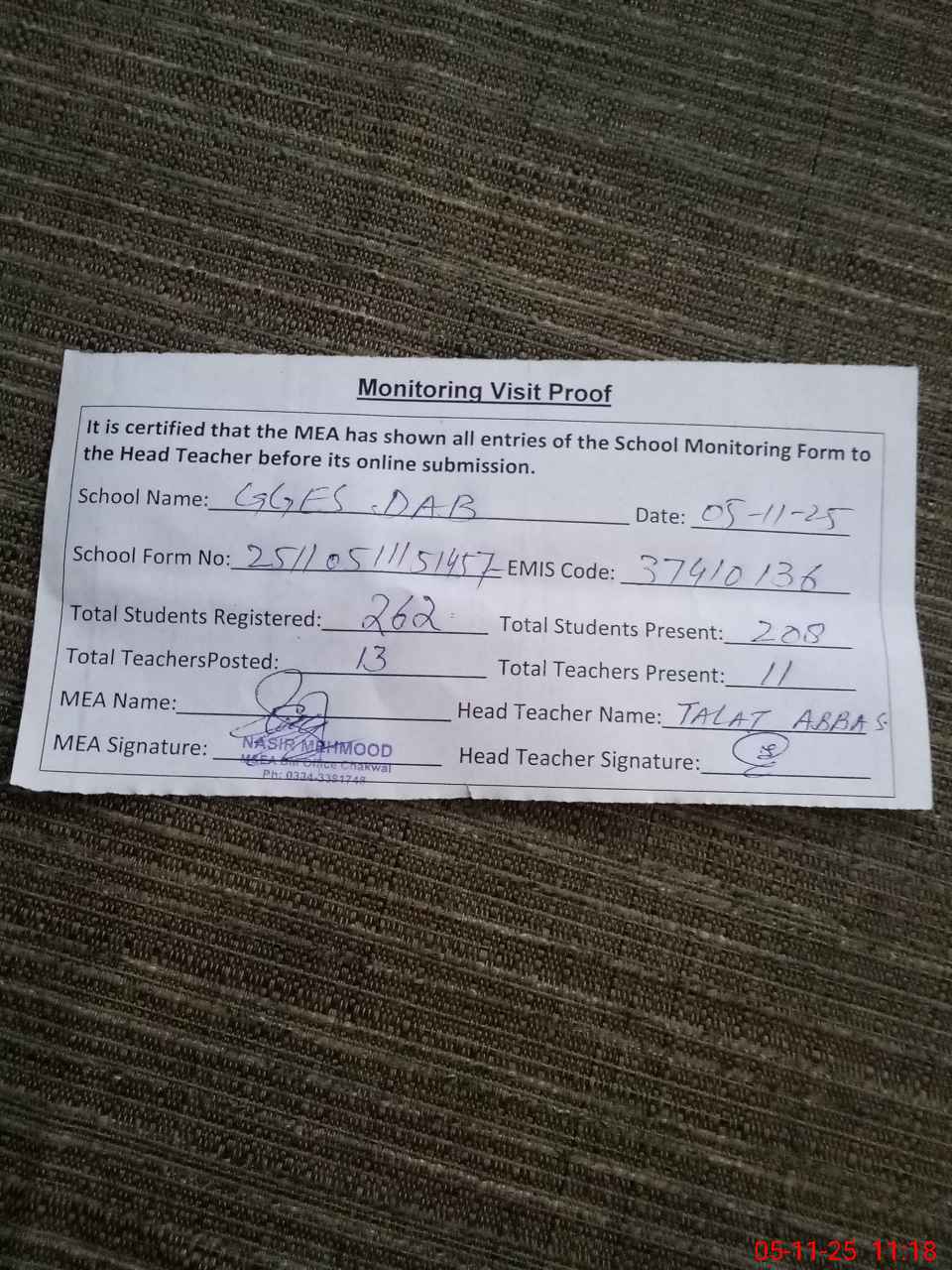 | Attendance Register | Head Teacher | MEA with School | Visit Proof |
