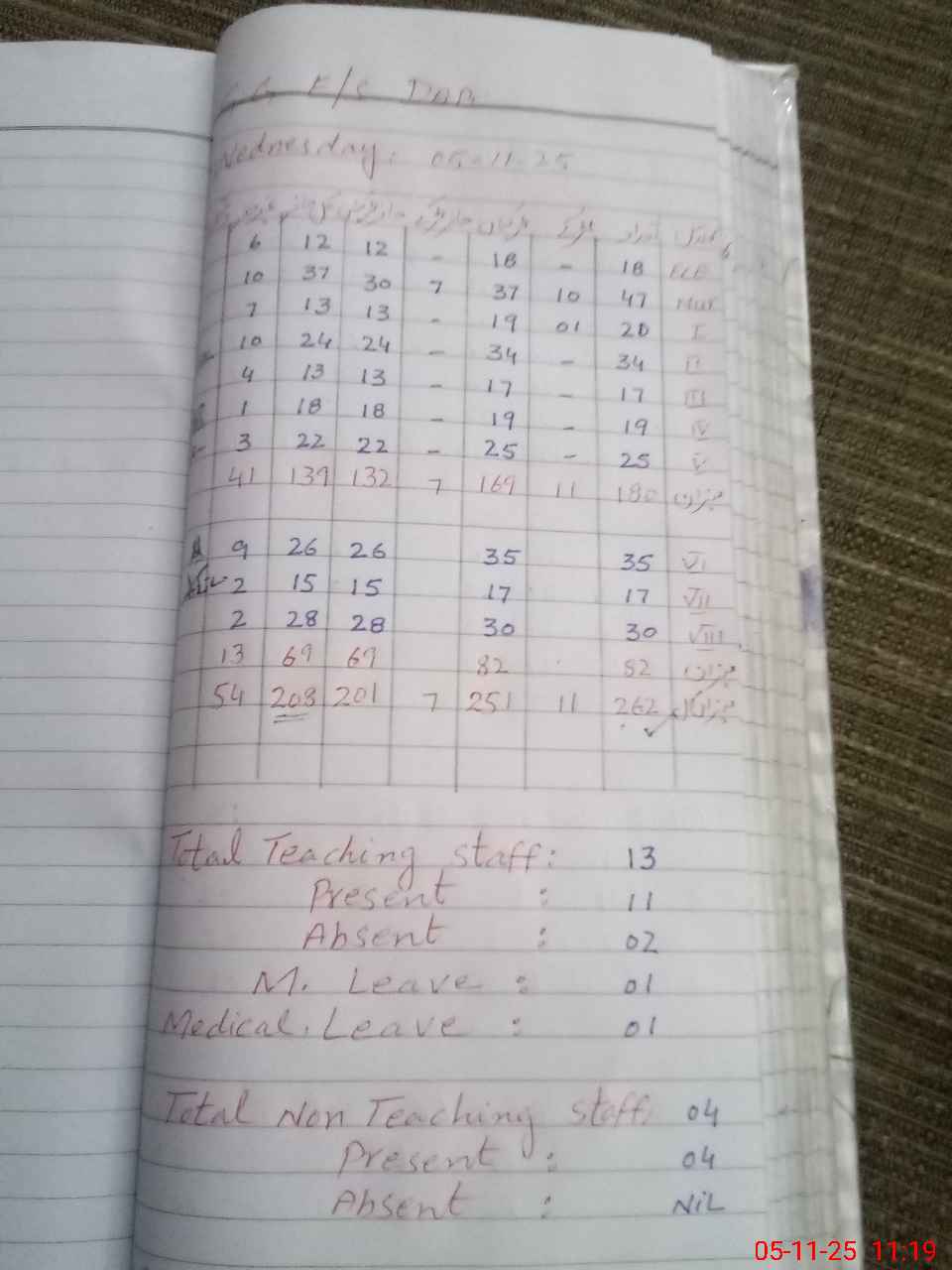 | No. of Students Present - Female | 12 | 0 | 30 | 13 | 24 | 13 | 18 | 22 | 26 | 15 | 28 | 201 | ||||