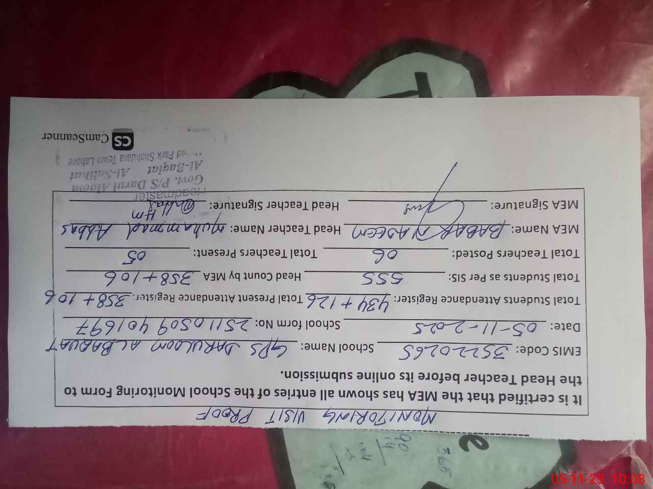 | Attendance Register | Head Teacher | MEA with School | Visit Proof |