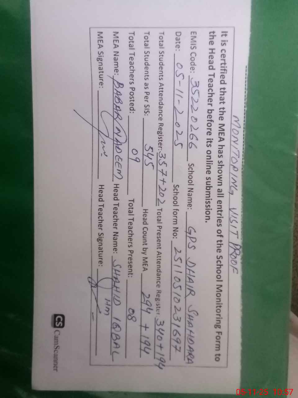 | EMIS Code: 35220266 | Name of School: GPS DHAIR SHAHDRA | |||
