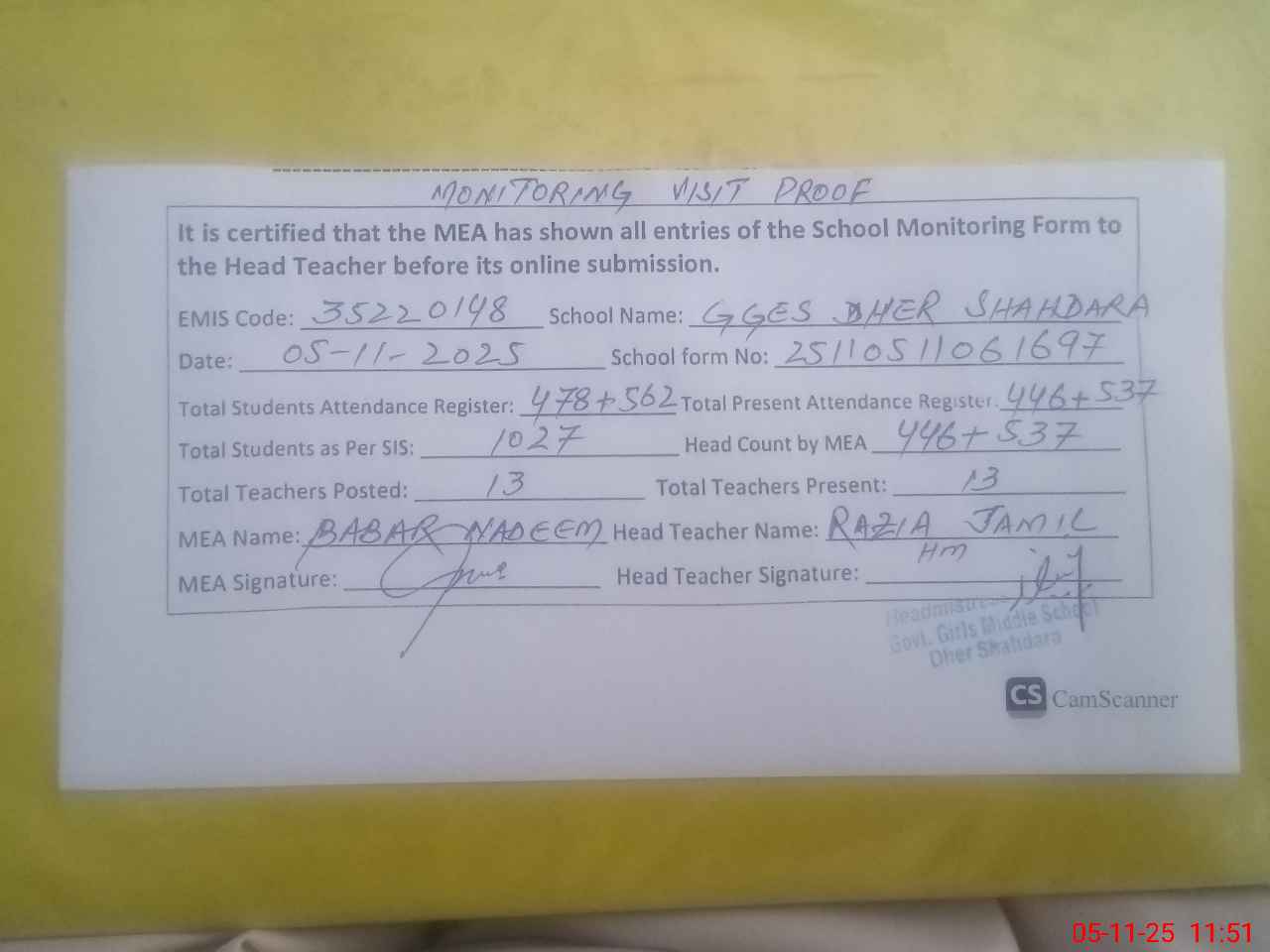 | EMIS Code: 35220148 | Name of School: GGES DHER SHAHDARA | |||