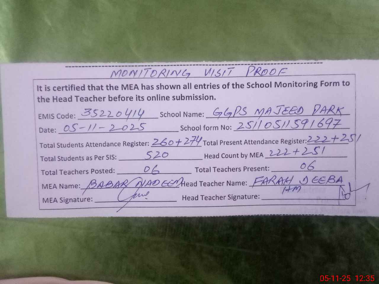 | EMIS Code: 35220414 | Name of School: GGPS MAJEED PARK SHAHDRA | |||